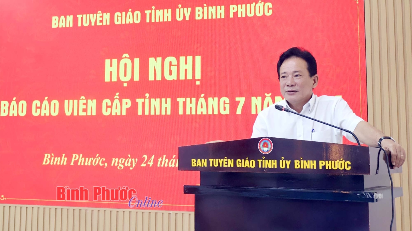 Bí thư Đảng ủy, Giám đốc Công ty Điện lực Bình Phước Lê Tấn Quang báo cáo tình hình sản xuất kinh doanh của đơn vị tại hội nghị báo cáo viên cấp tỉnh tháng 7