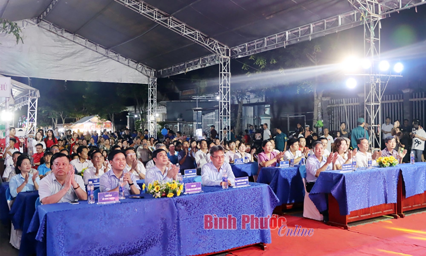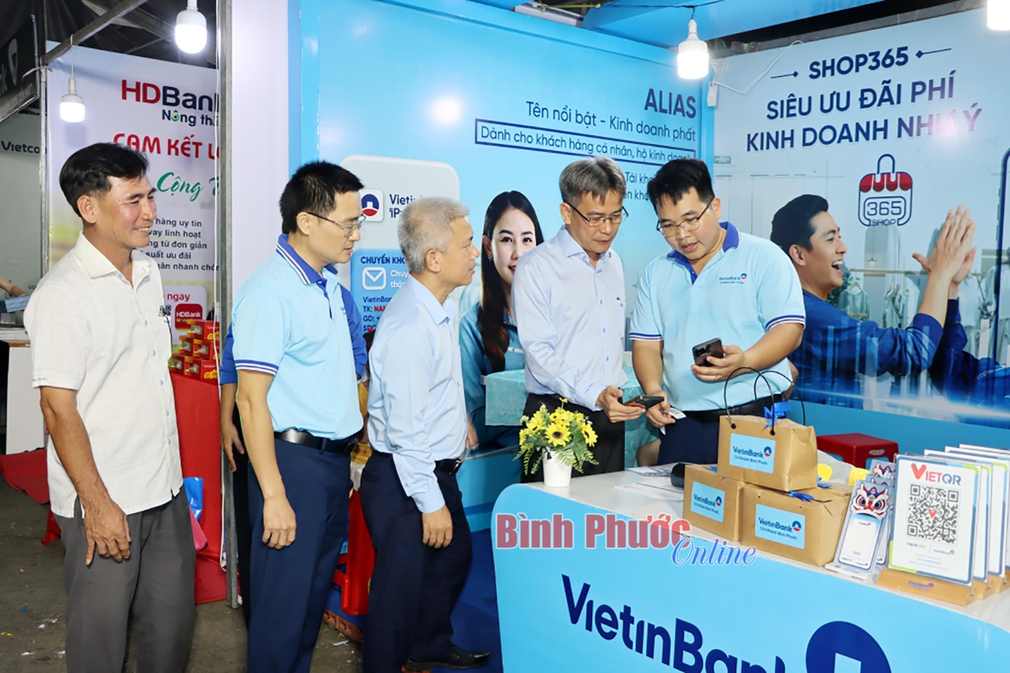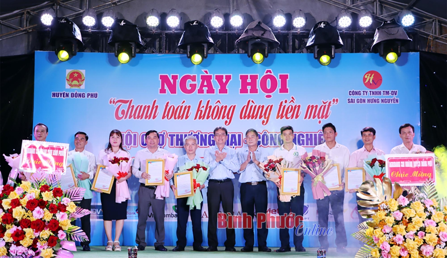 Các đại biểu và đông đảo người dân tham dự lễ khai mạc Ngày hội "Thanh toán không dùng tiền mặt” diễn ra trong 2 ngày 30 và 31-7, với sự đồng hành của 8 ngân hàng, 2 doanh nghiệp viễn thông. Trước đó, để tạo thuận lợi cho người dân mua sắm, trải nghiệm, huyện Đồng Phú đã phối hợp Công ty Sài Gòn Hưng Nguyễn tổ chức hội chợ “Thương mại - Công nghiệp” với 90 gian hàng có đầy đủ các chủng loại hàng hóa từ đồ gia dụng, giày dép, quần áo, chăn ga gối nệm, phụ kiện, trang sức đến thức ăn, đồ uống mang đậm văn hóa vùng miền… Hội chợ diễn ra từ ngày 27-7 đến ngày 4-8.