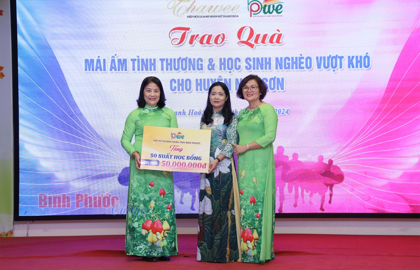 Dịp này, Hội Nữ doanh nhân tỉnh Bình Phước đã trao tặng 1 căn nhà mái ấm tình thương trị giá 80 triệu đồng, 50 suất học bổng cho học sinh nghèo vượt khó trên địa bàn huyện Nga Sơn, tỉnh Thanh Hóa.