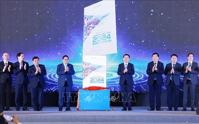 Thủ tướng Phạm Minh Chính và các đại biểu thực hiện nghi thức công bố Báo cáo Logistics Việt Nam 2024. Ảnh: Dương Giang/TTXVN