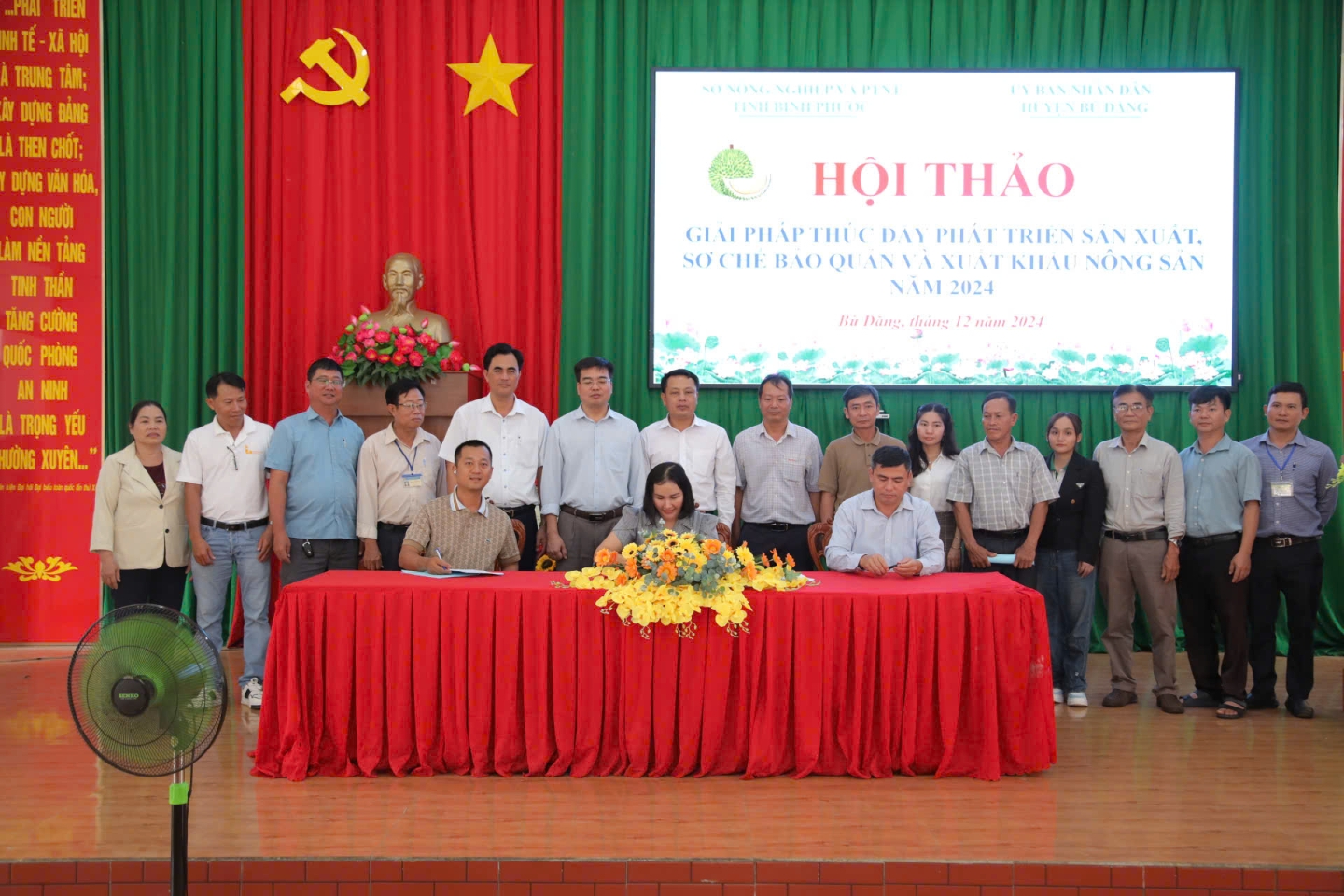 Các đại biểu tham dự hội thảo chứng kiến việc ký hợp tác liên kết sản xuất sầu riêng giữa doanh nghiệp và hợp tác xã