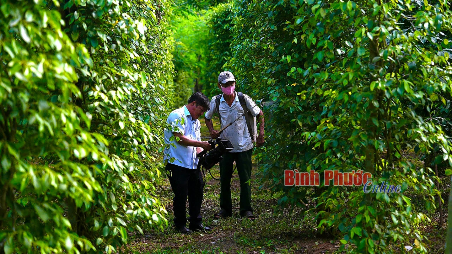 Tác giả đang tác nghiệp tại vườn tiêu hữu cơ được chăm sóc theo quy trình sinh học chế phẩm IMO do huyện Lộc Ninh chuyển giao