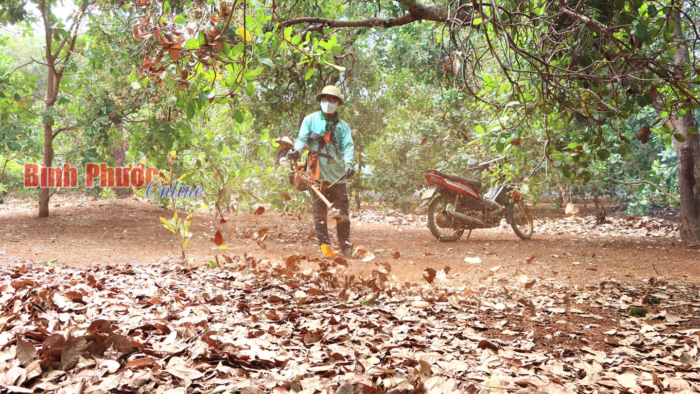 Dù đang vào chính vụ, nhưng vườn điều của hộ anh Điểu Hiệp ở thôn 4, xã Đắk Ơ, huyện Bù Gia Mập cho thu không đáng kể. Trong ảnh: Anh Hiệp tranh thủ vệ sinh vườn để tiện việc thu hoạch cũng như phòng cháy trong mùa khô