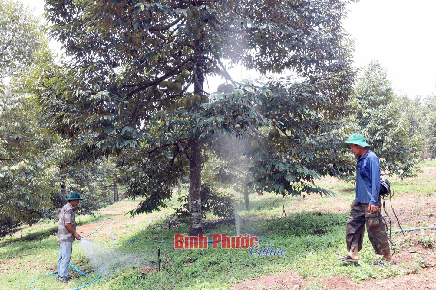 Năm nay, do thời tiết khắc nghiệt nên nhiều vườn sầu riêng bị rụng trái với tỷ lệ cao, lượng trái còn lại trên cây không nhiều. Do vậy, các hộ dân cố gắng chăm sóc tốt để được thu hoạch. Đi thăm tình hình sản xuất sầu riêng của thành viên hợp tác xã (HTX), ông Hồ Thanh Thuận, Phó Giám đốc HTX thương mại, dịch vụ Bom Bo Bình Phước cho biết: HTX có 150 ha ở một số xã của huyện Đồng Phú. Năm nay, thời tiết rất khắc nghiệt, một số nơi khó khăn về nước tưới. Hầu hết các hộ thành viên HTX đã đầu tư giếng khoan, đào ao tích trữ nước, tuy nhiên vẫn có những ao cạn trơ đáy, nước giếng khoan xuống sâu. Chúng tôi đề nghị bà con trong HTX chia sẻ nguồn nước cho nhau; kiểm tra vườn hằng ngày để kịp thời phát hiện và phòng trị sâu, bệnh. Thời điểm này, trái sầu riêng đang thời kỳ phát triển mạnh, nhu cầu nước tưới cao, khi cây không đủ nước sẽ bị suy kiệt, các loại sâu, bệnh cũng sẽ tấn công gây hại, ảnh hưởng năng suất và chất lượng.