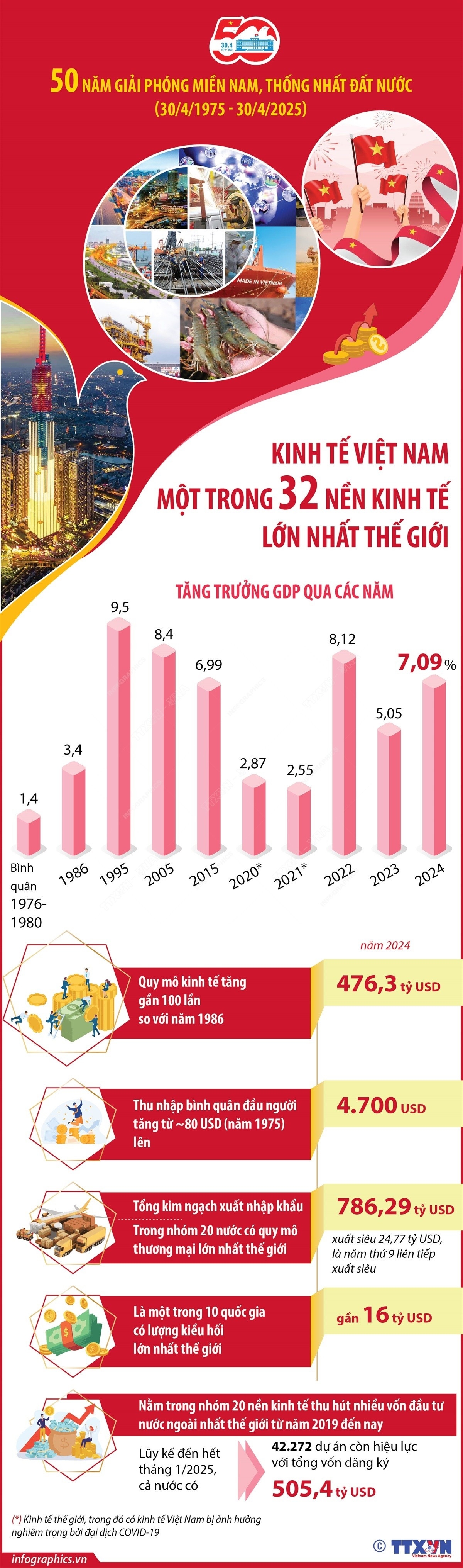 Sau 50 năm giải phóng miền Nam, thống nhất đất nước, từ một nền kinh tế nghèo nàn, lạc hậu, trình độ thấp, bị bao vây, cấm vận, Việt Nam đã trở thành một trong 32 nền kinh tế lớn nhất thế giới, quy mô kinh tế tăng gần 100 lần so với năm 1986, thu nhập bình quân đầu người tăng từ dưới 100 USD năm 1975 lên gần 5.000 USD năm 2024.