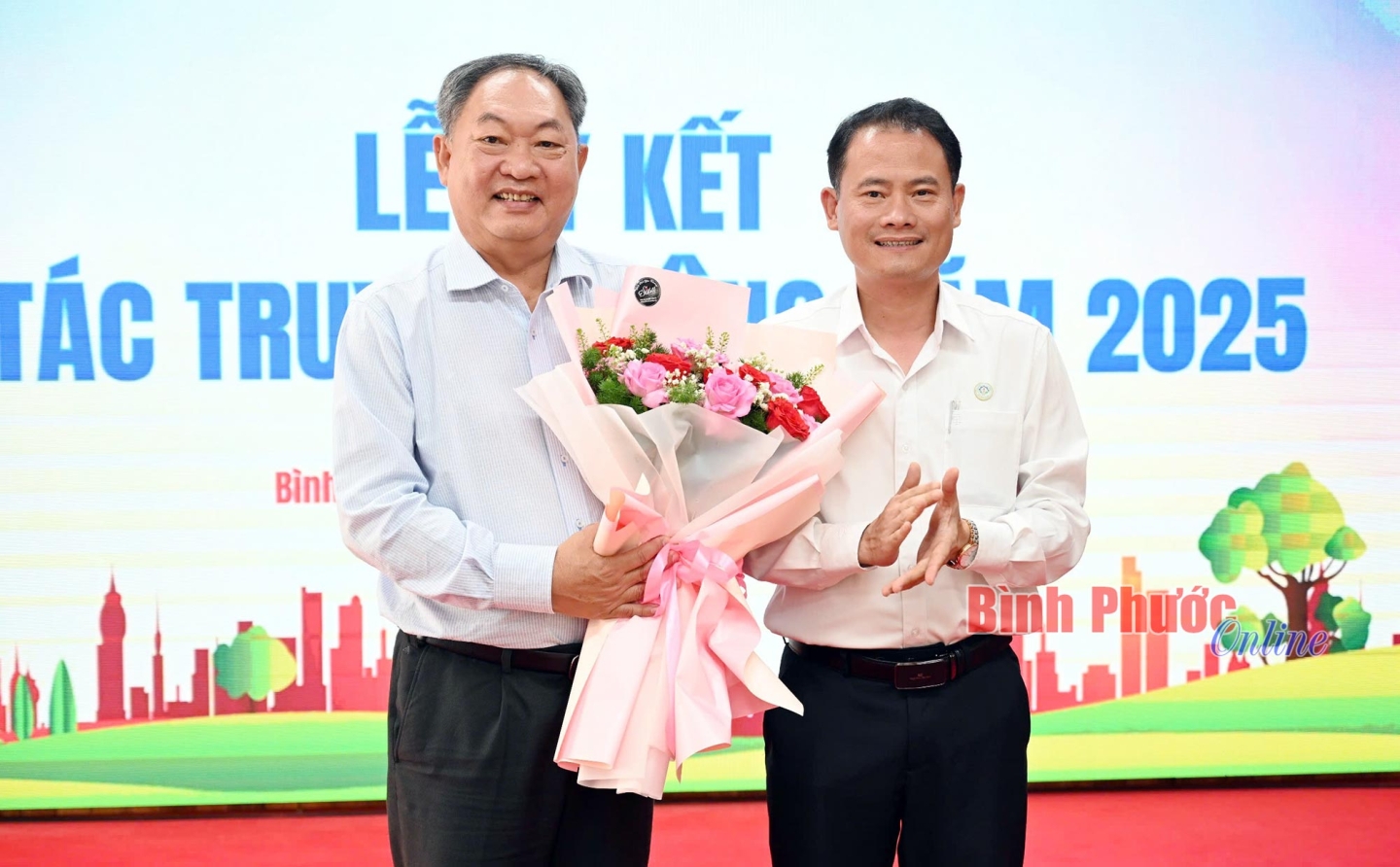 Trường cao đẳng Miền Đông tặng hoa cho Đài Phát thanh - Truyền hình và Báo Bình Phước chúc mừng sự hợp tác của hai đơn vị