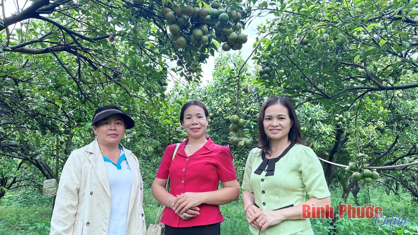 Cán bộ Hội LHPN huyện Đồng Phú và xã Thuận Phú tham quan mô hình trồng quýt của hội viên Tổ hợp tác trồng cây ăn trái ấp Bàu Cây Me