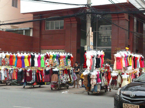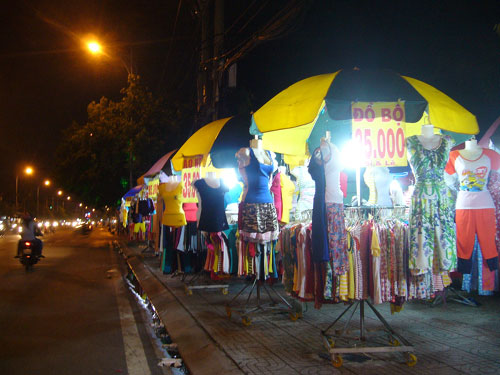 Náo nhiệt nhất là những tuyến đường như Nguyễn Trãi (từ Q.1 đến Q.5), CMT8, Lê Văn Sỹ (từ Q.3 đến Q.Tân Bình), Hai Bà Trưng, Nguyễn Đình Chiểu (Q.1 đến Q.3), Phạm Văn Hai (Q.Tân Bình), Nguyễn Kiệm, Phạm Ngũ Lão, Nguyễn Oanh (Q.Gò Vấp), Lê Quang Định (Q.Bình Thạnh) và trước các khu chợ Phạm Văn Hai (Q.Tân Bình), chợ Bà Chiểu (Q.Bình Thạnh), Hạnh Thông Tây (Q.Gò Vấp)… Từ khoảng 4g chiều, hàng loạt quần áo, mũ nón, giày dép, khăn choàng, túi xách, ví, dây nịt… được treo trên các cây sào di động hoặc đổ đống khắp vỉa hè, thậm chí tràn cả ra lòng đường. Hàng hóa ở đây có màu sắc sặc sỡ, đa dạng kiểu dáng, giá chỉ từ 20.000đ/cái mũ, 50.000-60.000đ/cái áo thun, áo sơ mi, quần short, khăn choàng…; giày dép giá 15.000-30.000đ/đôi, đầm, túi xách từ 80.000đ/cái, kính mát 15.000-35.000đ/cái...