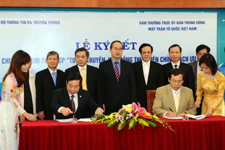 * Tại buổi làm việc Bộ Thông tin và Truyền thông và Ban Thường trực Ủy ban Trung ương MTTQ Việt Nam đã ký kết chương trình phối hợp tuyên truyền, vận động thực hiện chính sách ưu đãi đối với người có công với cách mạng giai đoạn 2014-2015.