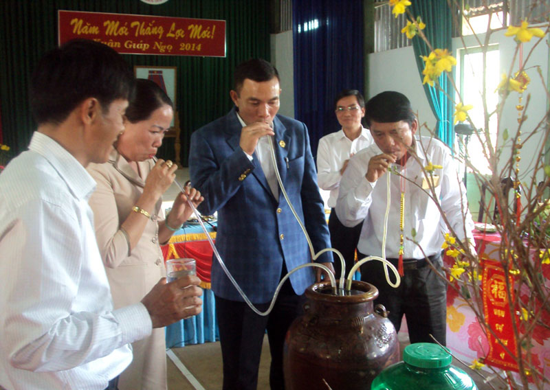 Tổng giám đốc Lê Thanh Tú (giữa) uống rượu cần đầu xuân trong ngày ra quân cùng cán bộ, công nhân Nông trường 2 và lãnh đạo xã nông trường đứng chân.