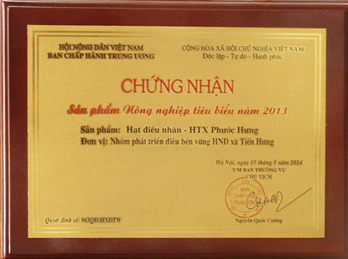 Giấy chứng nhận sản xuất điều bền vững do Hội Nông dân Việt Nam trao tặng