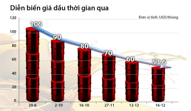 Chiều 16-12, giá dầu xuống mức 53,6 USD/thùng, mức thấp nhất kể từ tháng 5-2009, theo số liệu từ Bloomberg. Tính ra giá dầu đã giảm xấp xỉ 45% kể từ đầu năm.