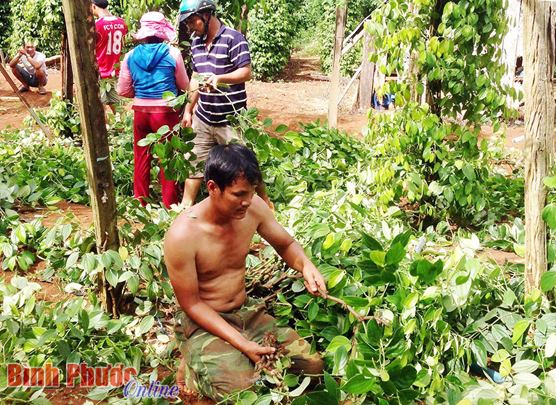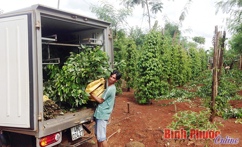 Gia đình ông Nguyễn Đình Việt, xã Hưng Phước (Bù Đốp) đã bán vườn tiêu gần 2 năm tuổi với giá 270 ngàn đồng/trụ và tư thương từ các tỉnh Tây Nguyên tìm đến Bình Phước mua dây tiêu giống và dùng ô tô để chở