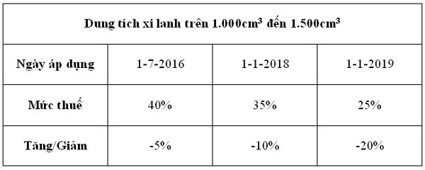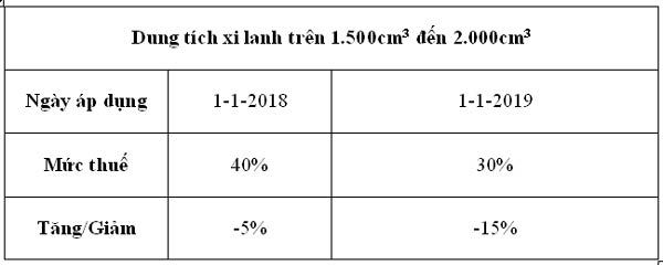 Cụ thể, đối với xe ô tô chở người từ 9 chỗ trở xuống, trừ loại có dung tích xi lanh trên 2.000cm³ đến 2.500cm³ giữ thuế suất 50% như hiện hành, các loại khác có mức thuế thay đổi như sau: