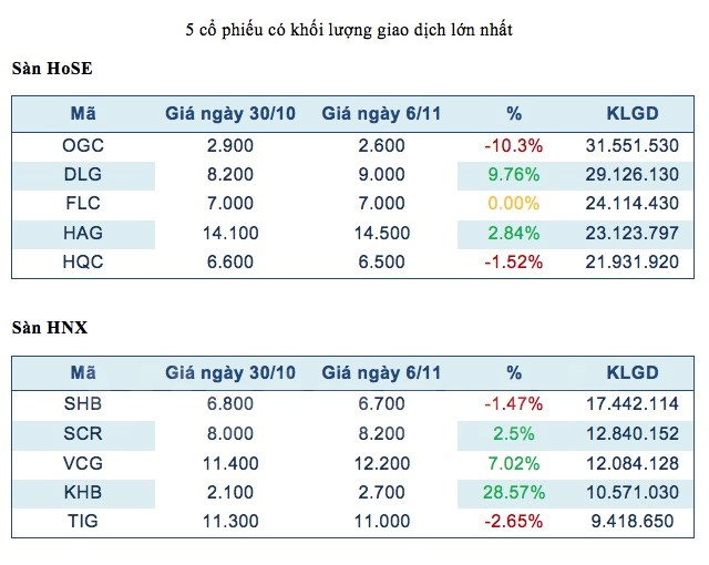 Trên sàn HNX, mã SHB tiếp tục có khối lượng cổ phiếu chuyển nhượng nhiều nhất, với 17,4 triệu đơn vị, tiếp đến là mã cổ SCR có khi lượng giao dịch đạt 12,8 triệu đơn vị đồng thời các mã VCG, KHB, TIG đứng tại các vị trí liền sau.