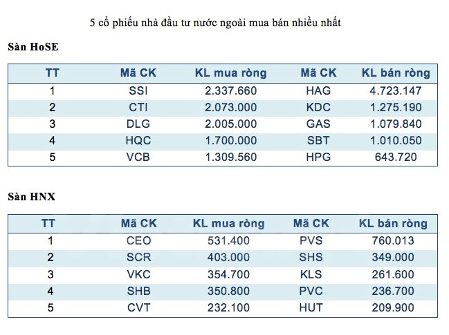 Phía sàn HNX, mã CEO được khối ngoại mua ròng mạnh nhất với 531.400 đơn vị. Các mã đứng ở những vị trí tiếp theo là SCR, VKC, SHB, CVT.