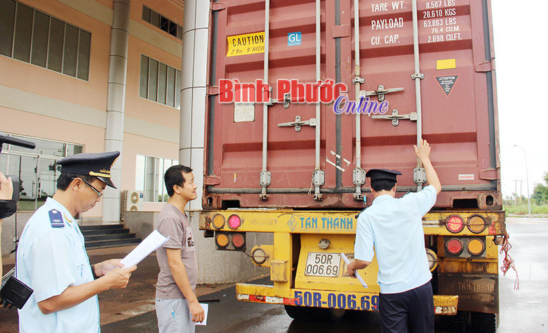 Cán bộ Chi cục Hải quan Hoa Lư kiểm tra hàng hóa trước khi xuất sang Campuchia - Ảnh: Hải Châu
