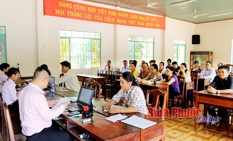 Cán bộ NHCSXH huyện Lộc Ninh làm thủ tục vay vốn cho người dân xã Lộc Điền (Lộc Ninh) - Ảnh: K.B
