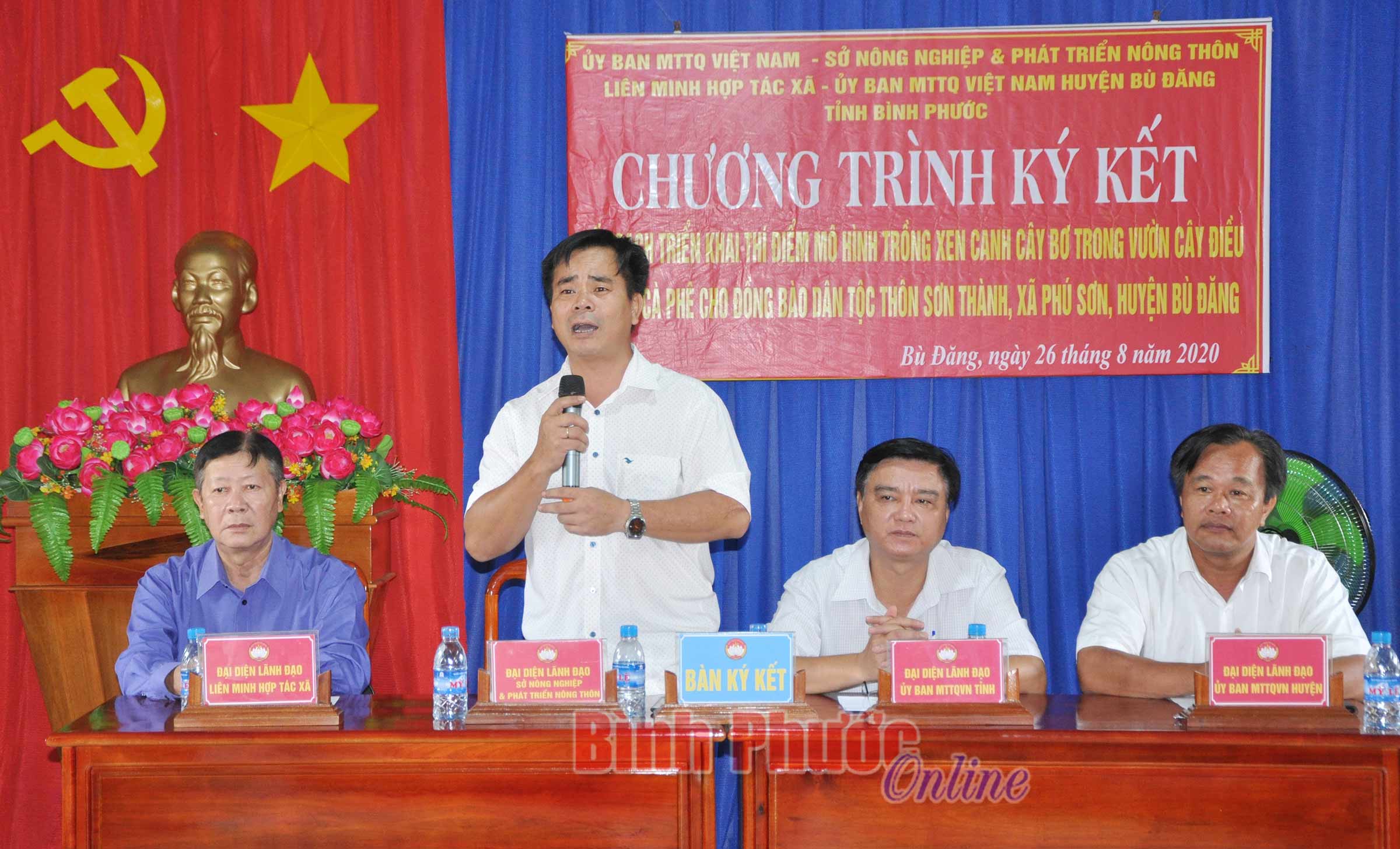 Tại buổi lễ, lãnh đạo 4 cơ quan, gồm Ủy ban MTTQ Việt Nam tỉnh, Sở NN&PTNT, Liên minh Hợp tác xã tỉnh, Ủy ban MTTQ Việt Nam huyện Bù Đăng đã ký kết chương trình dự án.