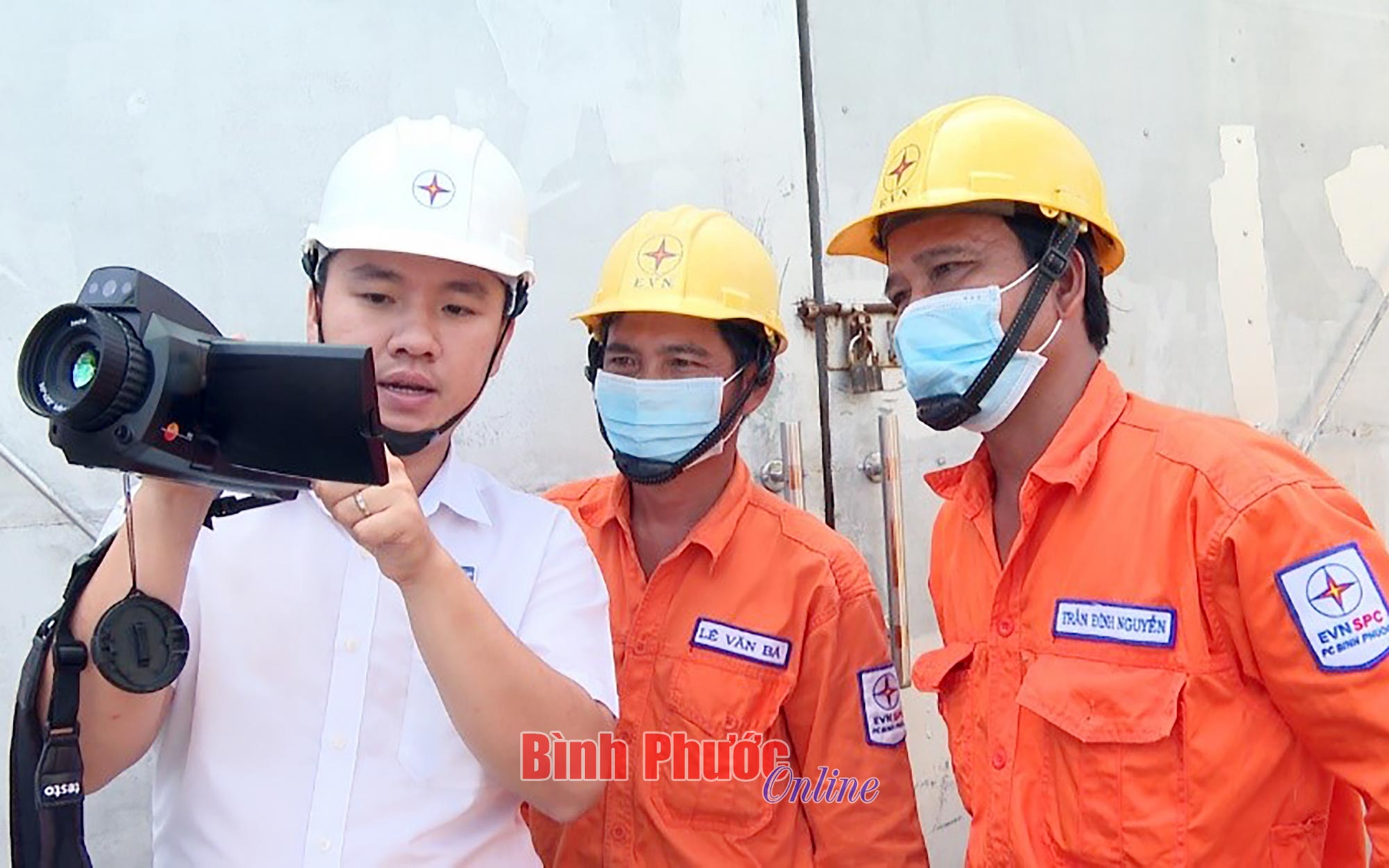 Nhân viên kỹ thuật Công ty Điện lực Bình Phước chuyển giao kỹ thuật sử dụng camera hồng ngoại cho nhân viên kỹ thuật Điện lực Bù Đăng - Ảnh: Trung Quang
