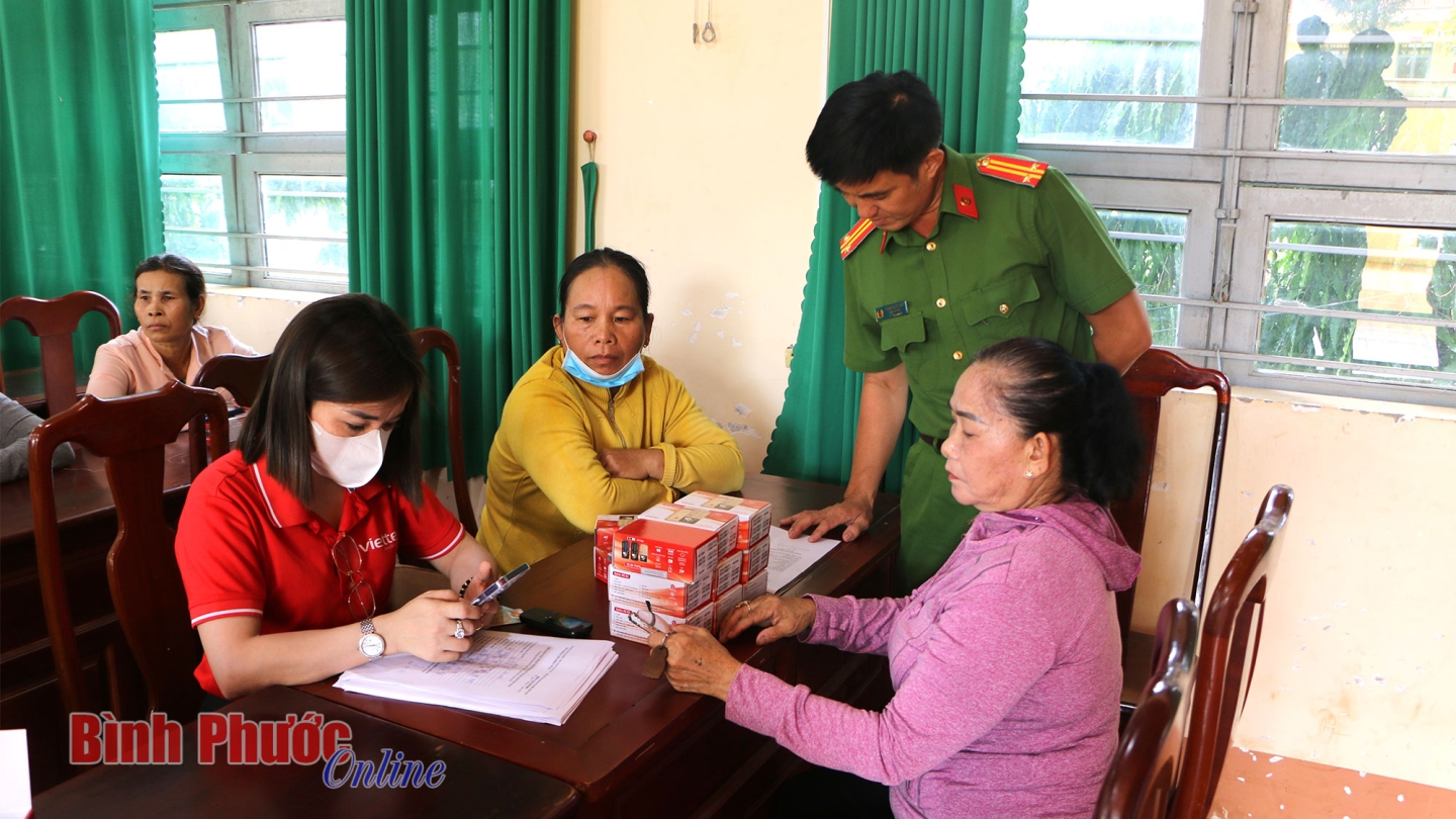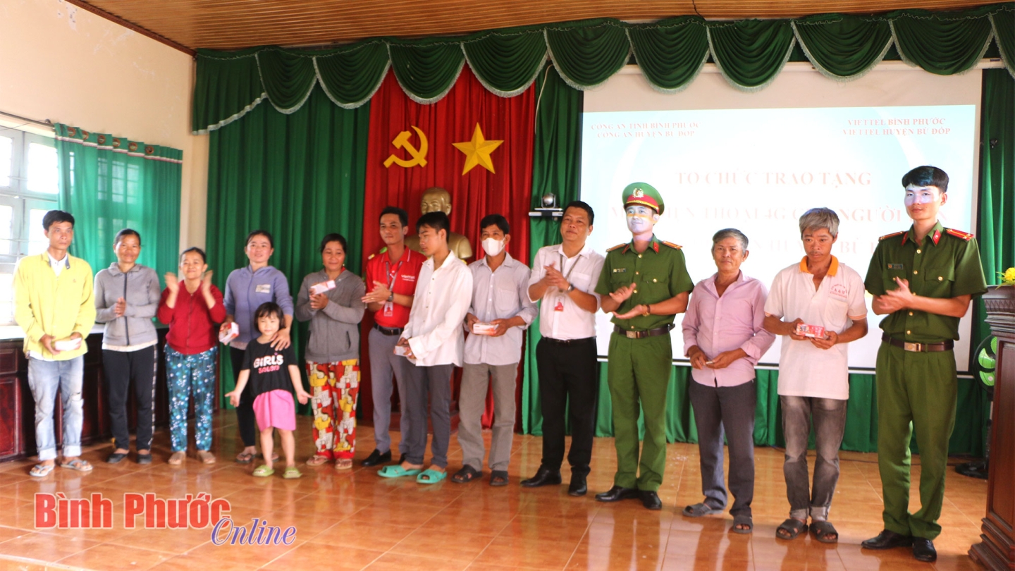 Người dân đến nhận điện thoại được nhân viên Viettel, cán bộ Đội cảnh sát Quản lý hành chính về trật tự xã hội Công an huyện Bù Đốp hỗ trợ cài đặt nhằm chuẩn hóa thông tin thuê bao di động, hỗ trợ định danh điện tử...