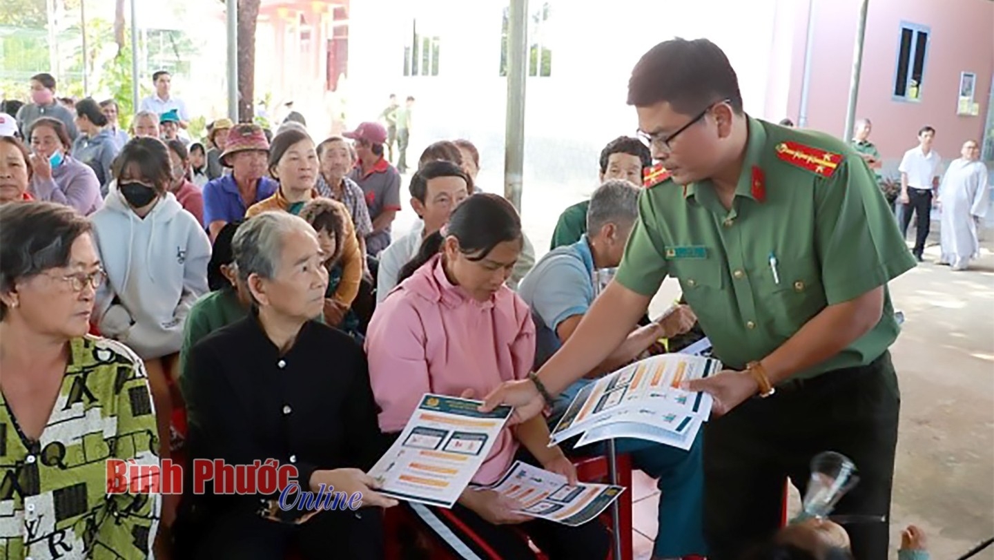 Cán bộ Phòng An ninh nội địa, Công an tỉnh phát tờ rơi tuyên truyền pháp luật cho người dân xã Tân Thành, huyện Bù Đốp - Ảnh tư liệu