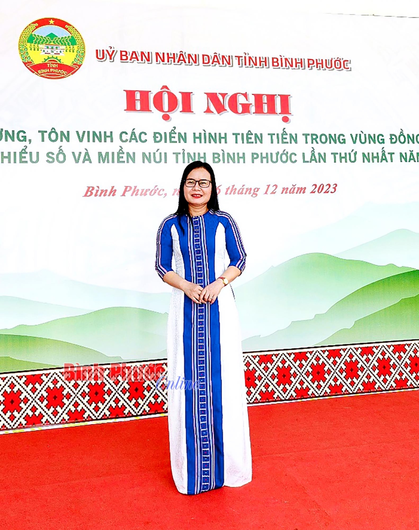 Áo dài thổ cẩm được chị Drênh Thị Hạnh, Phó Chủ tịch UBND xã Quang Minh mặc khi tham gia các sự kiện trọng đại
