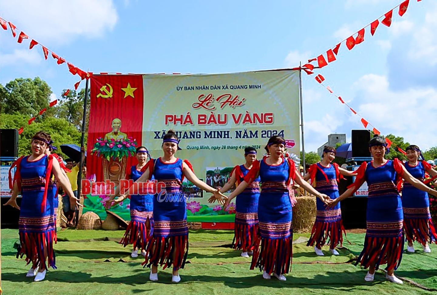 Thổ cẩm được may thành các bộ váy để biểu diễn văn nghệ tại lễ hội Phá bàu xã Quang Minh