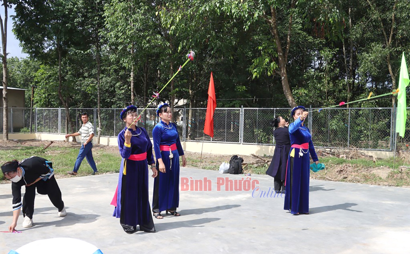 Các trung niên, thanh niên người Tày, Nùng ở huyện Đồng Phú chơi lày cỏ trong dịp phục dựng lễ hội Lồng tồng tháng 8-2024, tại xã Tân Phước