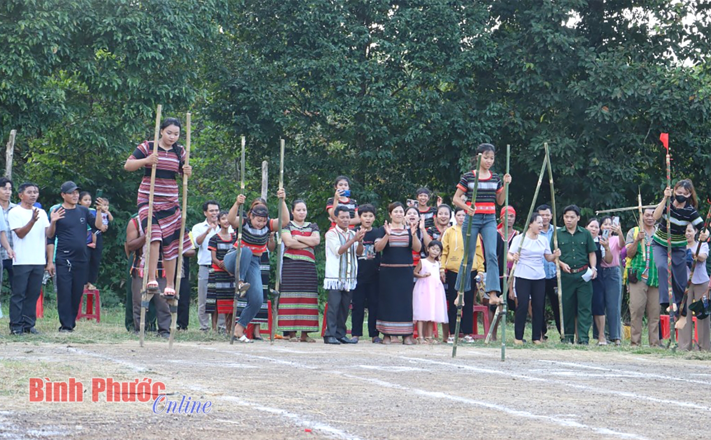 Thi đi cà kheo đã trở nên rất phổ biến ở nhiều nơi. Trong ảnh: Bà con S’tiêng xã Thanh An, huyện Hớn Quản thi đi cà kheo trong dịp phục dựng lễ cầu an