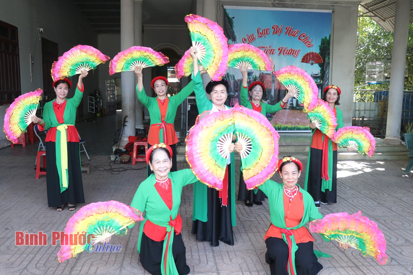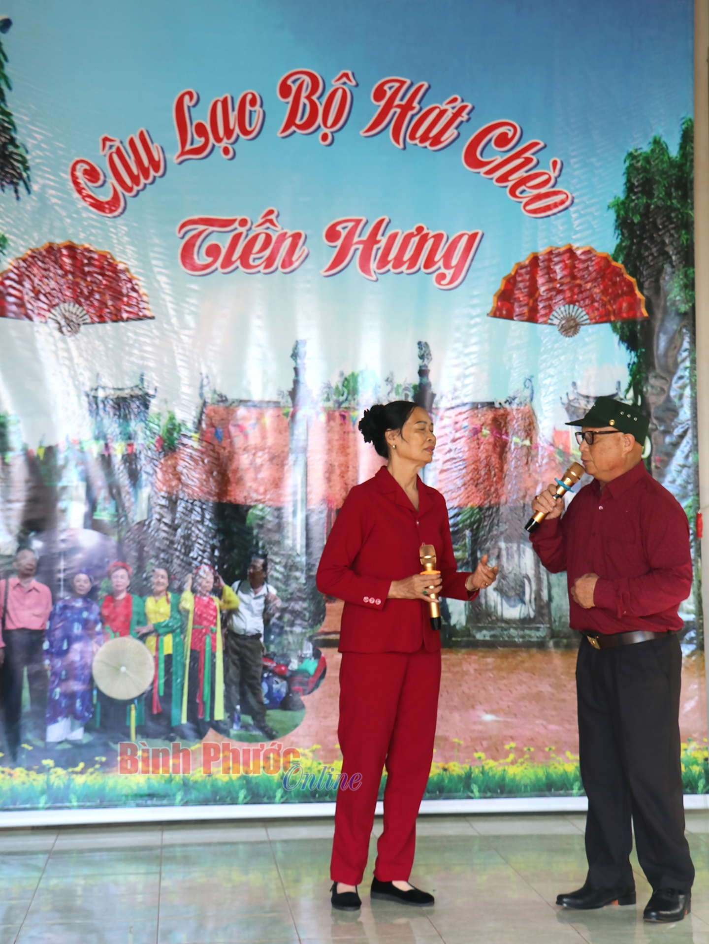 Trong không khí họp mặt sum vầy ấm áp, khúc chào xuân dưới giọng hát chèo ngọt ngào của nghệ nhân quê lúa Thái Bình Vũ Thị Diệp, Chủ nhiệm Câu lạc bộ (CLB) hát chèo Tiến Hưng, TP. Đồng Xoài và những vũ điệu thướt tha của nhóm múa trong trang phục áo tứ thân càng tôn thêm giá trị văn hóa nghệ thuật phi vật thể quốc gia trên quê hương Bình Phước những ngày tết đến, xuân về. Bà Diệp cho biết: Gặp nhau trên mảnh đất Bình Phước, những người con quê Thái Bình, Nam Định, Hà Nam dịp tết đến, xuân về lại nhớ quê hương và điệu chèo sẽ giúp nguôi ngoai nỗi nhớ quê nhà. Vì vậy, mỗi độ xuân về, các thành viên CLB cùng nhau ca múa về mùa xuân, quê hương, đất nước và tuổi trẻ… Những bài hát, điệu múa phù hợp, hòa quyện vào nhau tạo không khí vui tươi, rộn rã.