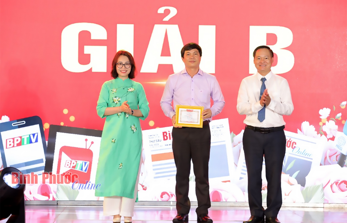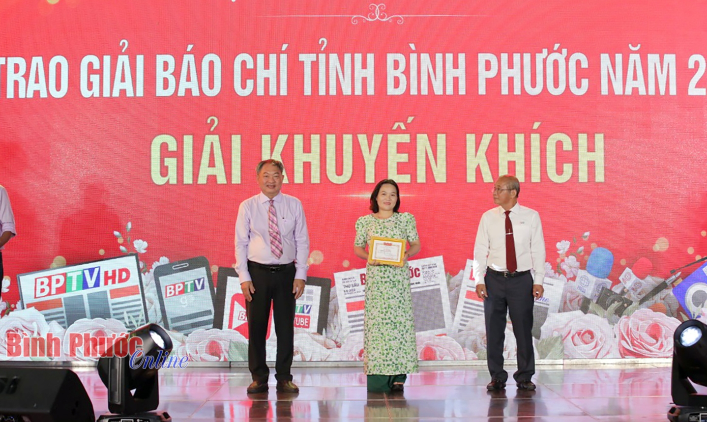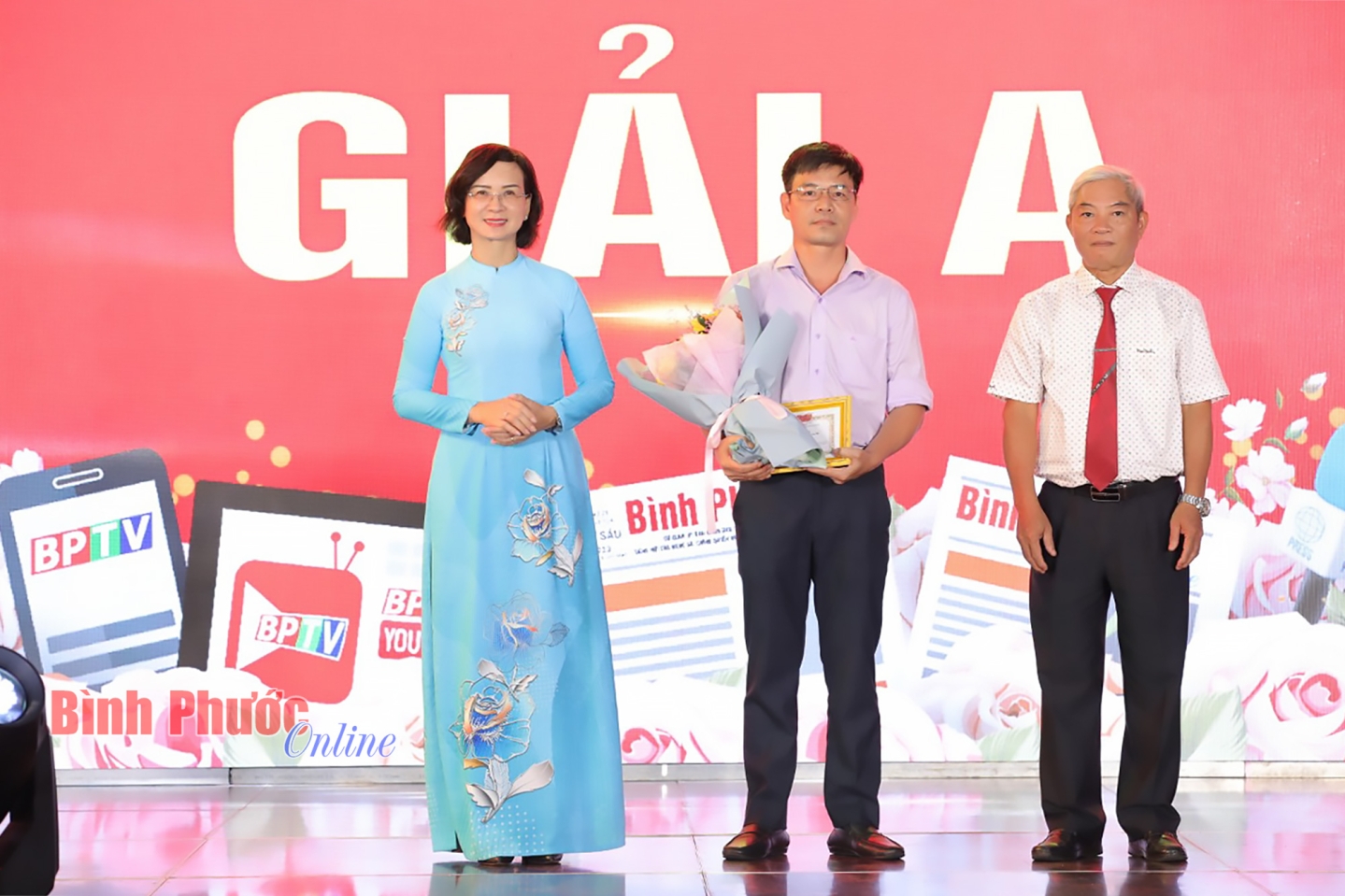 Phó Bí thư Thường trực Tỉnh ủy, Chủ tịch HĐND tỉnh Huỳnh Thị Hằng và Ủy viên Ban Thường vụ Tỉnh ủy, Phó Chủ tịch UBND tỉnh Trần Tuyết Minh trao giải đặc biệt tác phẩm về Bình Phước xuất sắc cho nhà báo Dư Hải (đơn vị Báo Thể thao Thành phố Hồ Chí Minh) với tác phẩm “Chiến binh xanh marathon - chinh phục đường đua với tinh thần thép”
