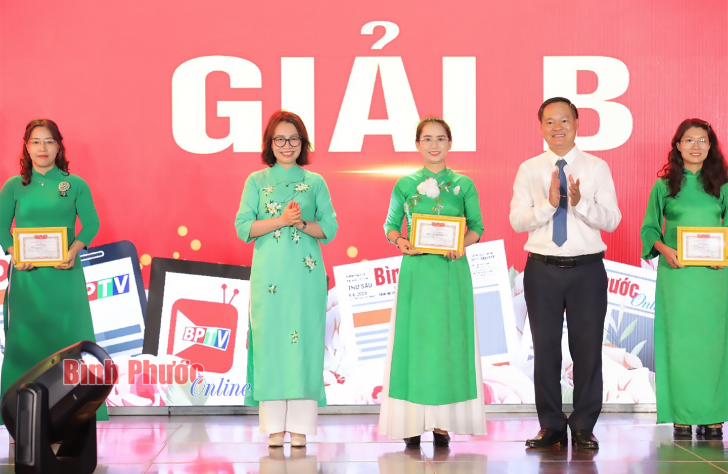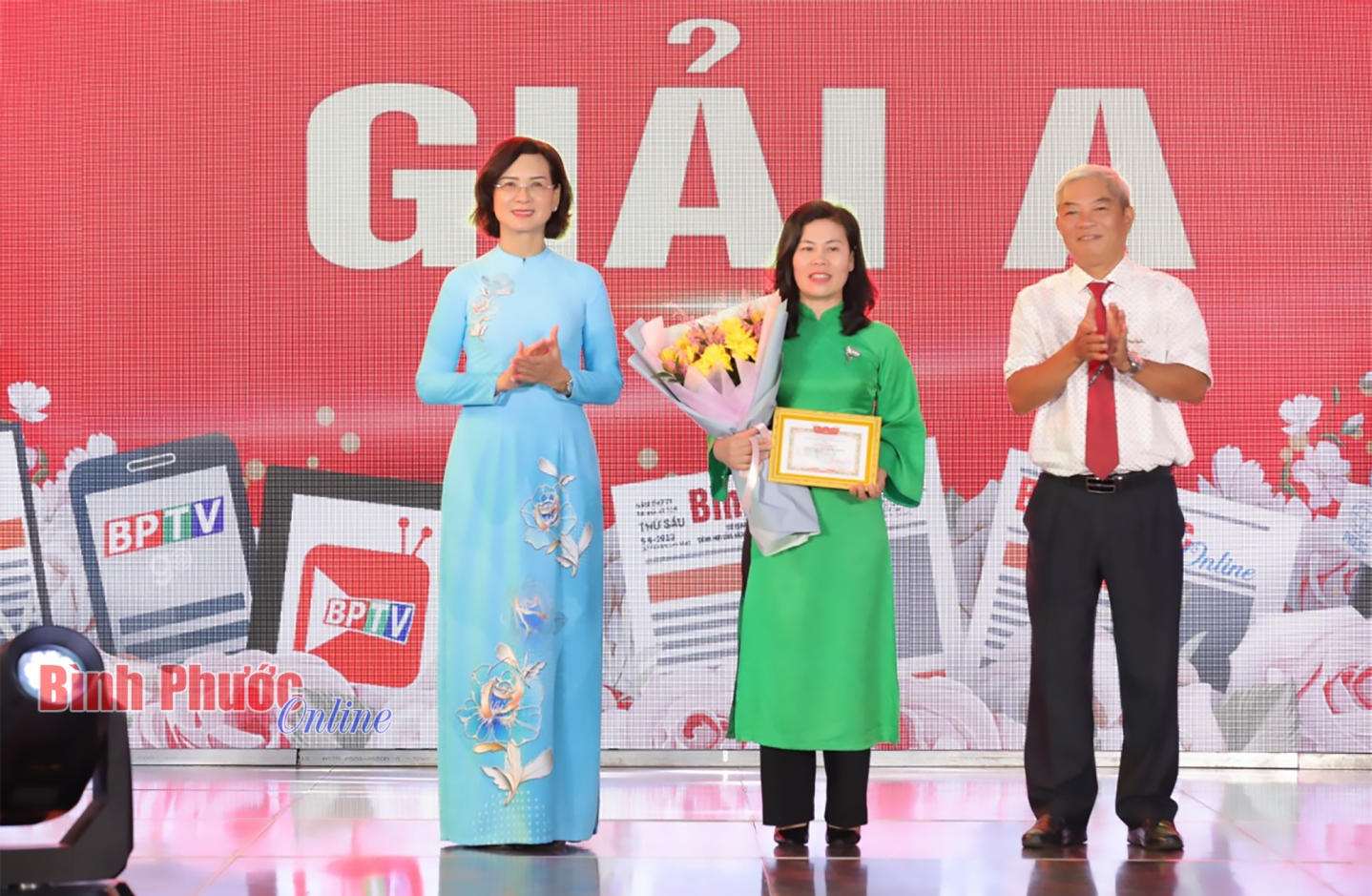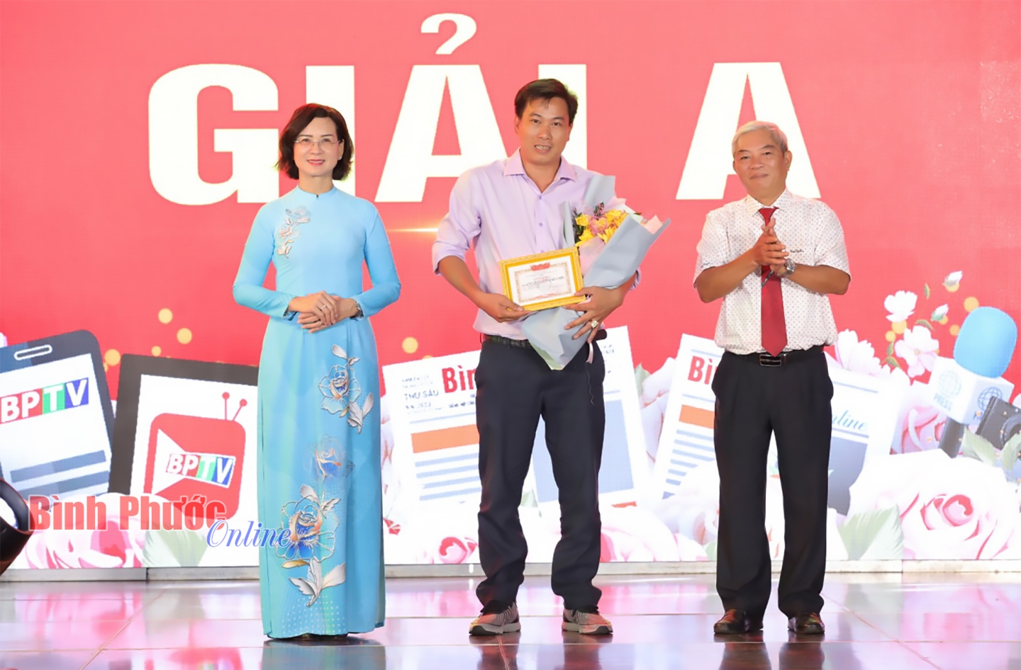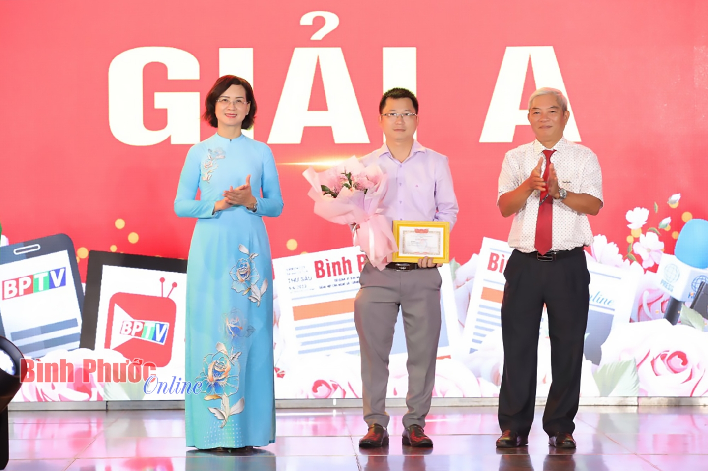 Phó Bí thư Thường trực Tỉnh ủy, Chủ tịch HĐND tỉnh Huỳnh Thị Hằng và Ủy viên Ban Thường vụ Tỉnh ủy, Phó Chủ tịch UBND tỉnh Trần Tuyết Minh trao giải đặc biệt tác phẩm về Bình Phước xuất sắc cho nhà báo Dư Hải (đơn vị Báo Thể thao Thành phố Hồ Chí Minh) với tác phẩm “Chiến binh xanh marathon - chinh phục đường đua với tinh thần thép”
