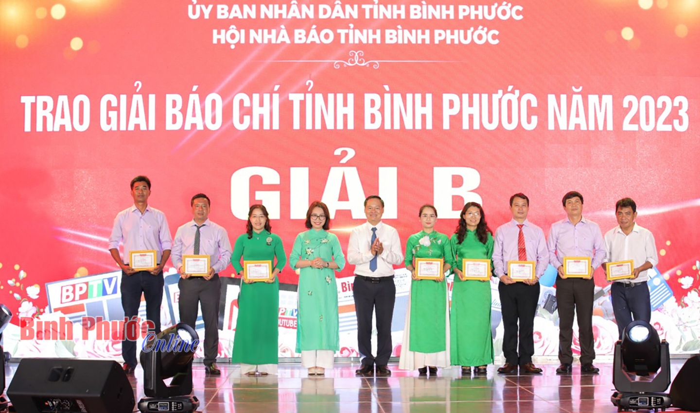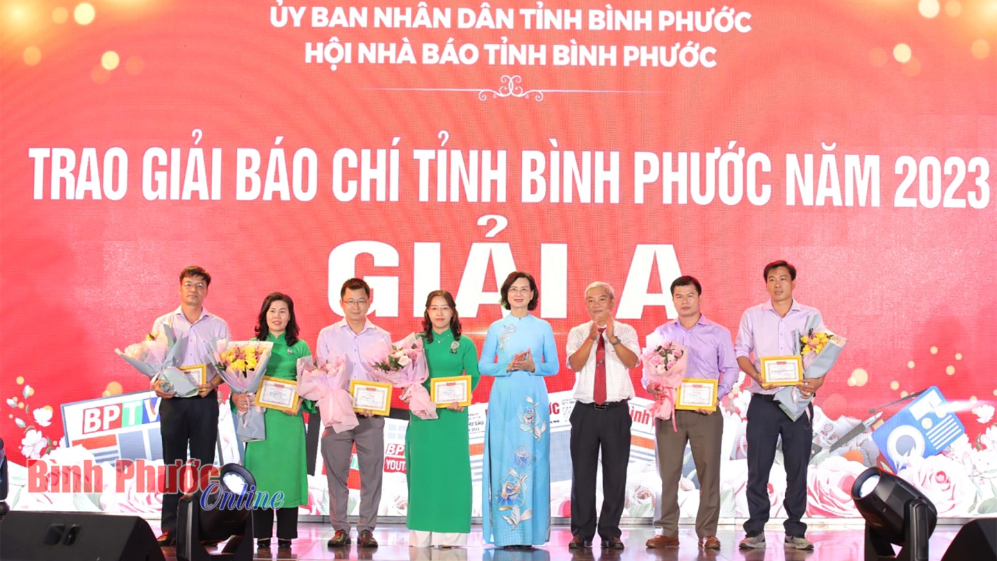 Ủy viên Ban Thường vụ Tỉnh ủy, Phó Chủ tịch UBND tỉnh Trần Tuyết Minh và Chủ tịch Hội Nhà báo tỉnh Bình Phước Đoàn Như Viên trao giải A cho các tác giả đoạt Giải báo chí tỉnh Bình Phước năm 2023
