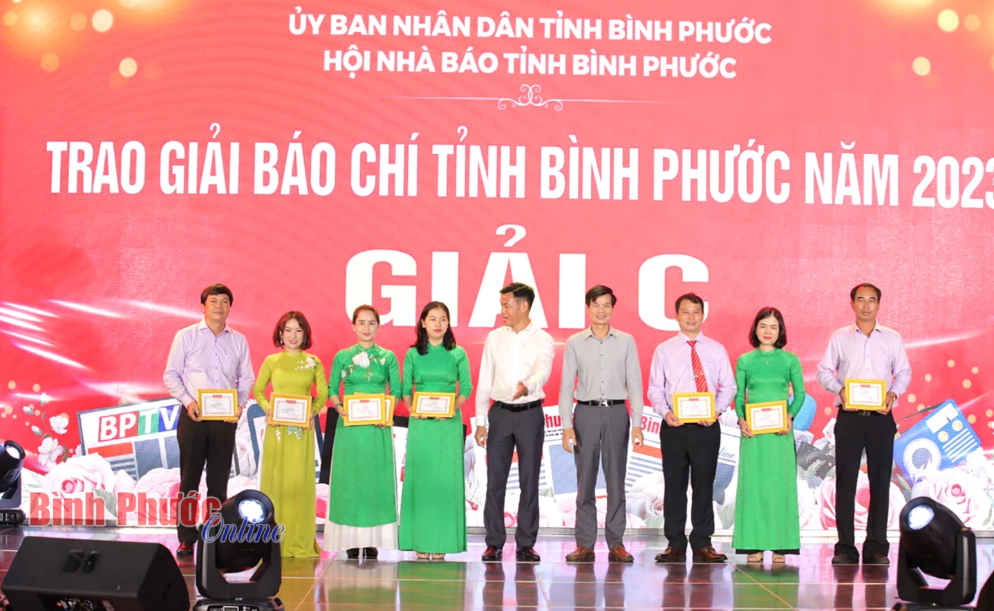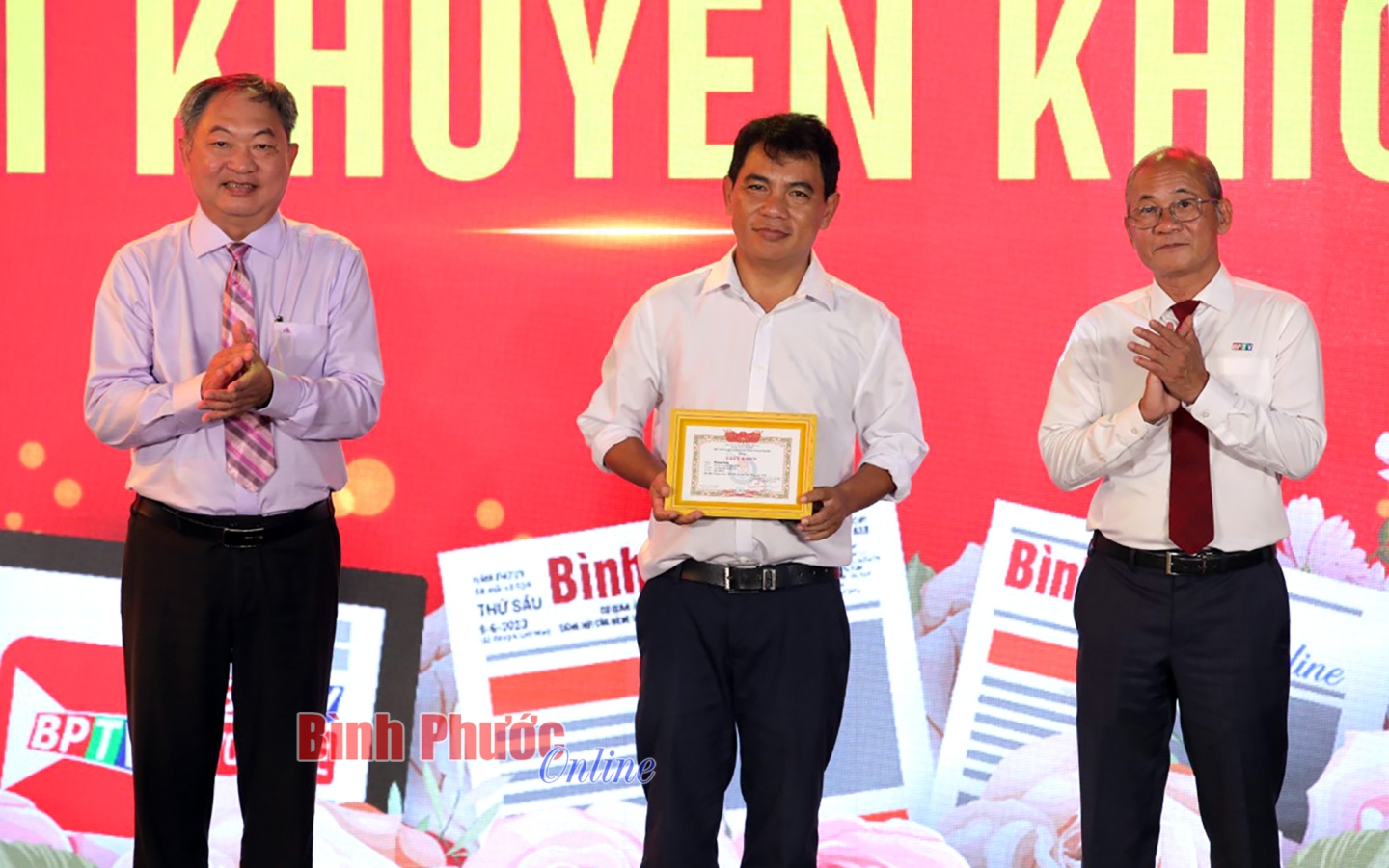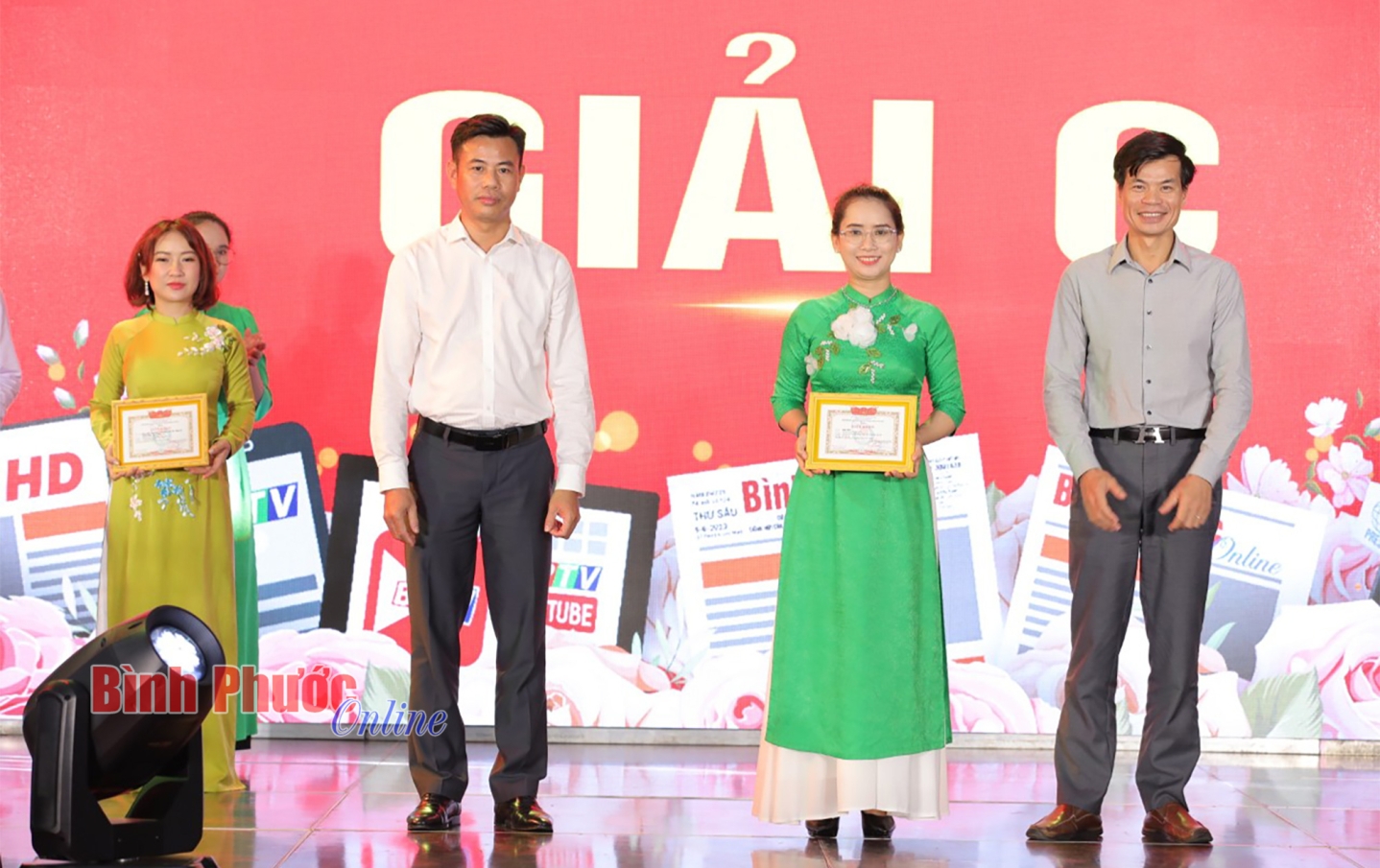 Phó Giám đốc Sở Thông tin và Truyền thông Nông Hồng Thức và nguyên Chủ tịch Hội Nhà báo, nguyên Giám đốc Đài Phát thanh - Truyền hình Bình Phước Phan Minh Hoàng trao giải C cho các tác giả