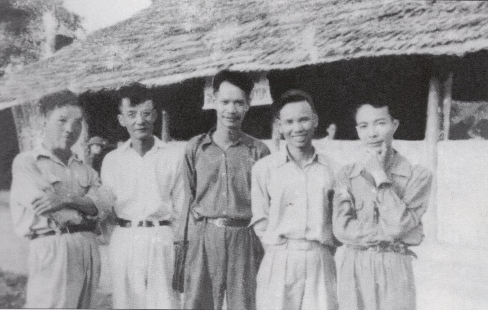 Ban Giám đốc Trường dạy làm báo Huỳnh Thúc Kháng, năm 1949. Từ trái sang: Như Phong, Tú Mỡ, Đỗ Đức Dục, Xuân Thủy, Đồ Phồn (Bùi Huy Phồn). Nguồn: Bảo tàng Báo chí Việt Nam