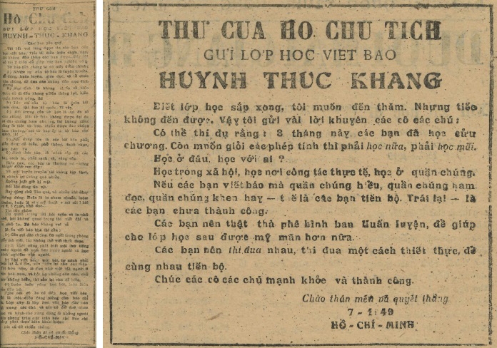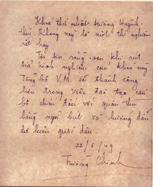 Thư của Bác Hồ gửi Trường dạy làm báo Huỳnh Thúc Kháng. Nguồn: Bảo tàng Báo chí Việt Nam