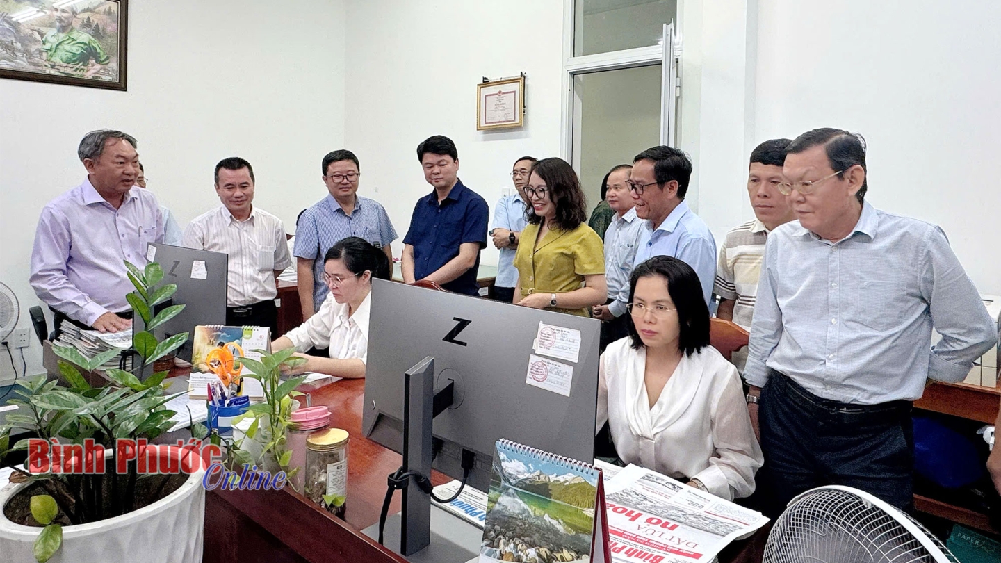 Đoàn công tác cơ quan báo chí các tỉnh miền Đông Nam Bộ tham quan tại phòng làm việc tổ báo in của Đài Phát thanh - Truyền hình và Báo Bình Phước - Ảnh: Nguyễn Ngân