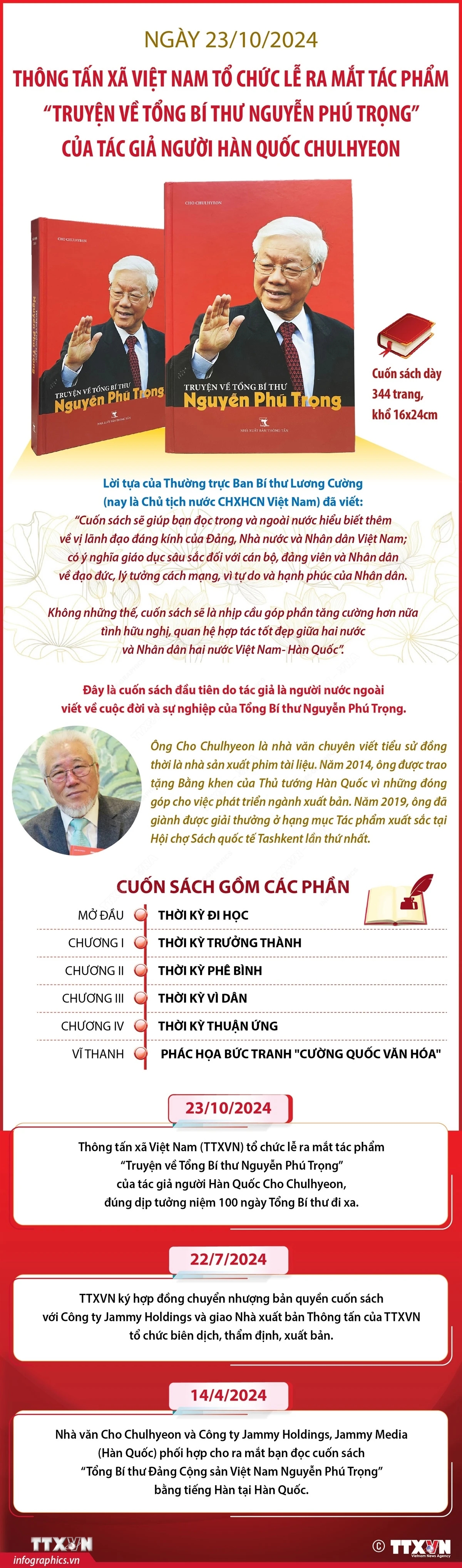 Sáng 23-10-2024, tại Trung tâm Thông tấn quốc gia, Nhà xuất bản Thông tấn thuộc Thông tấn xã Việt Nam tổ chức lễ ra mắt tác phẩm "Truyện về Tổng Bí thư Nguyễn Phú Trọng" của tác giả người Hàn Quốc Cho Chulhyeon, đúng dịp tưởng niệm 100 ngày Tổng Bí thư đi xa (19-7-2024 - 27-10-2024).