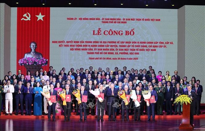 Tổng Bí thư Tô Lâm trao các nghị quyết, quyết định của Trung ương về việc sáp nhập đơn vị hành chính và thành lập tổ chức đảng, chỉ định cấp ủy, HĐND, UBND, Ủy ban MTTQ Việt Nam của TP Hồ Chí Minh. Ảnh: Thống Nhất/TTXVN