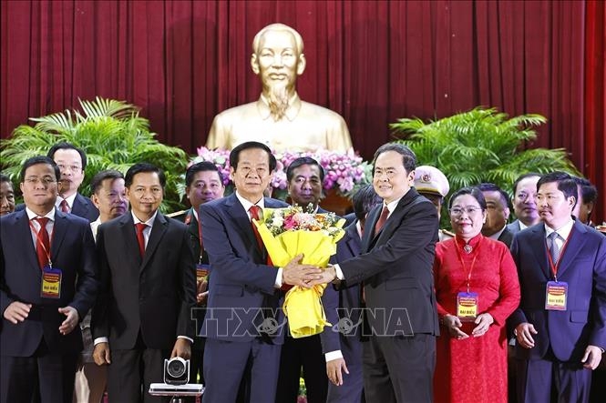 Chủ tịch Quốc hội Trần Thanh Mẫn trao các Quyết định của Bộ Chính trị, Ban Bí thư và tặng hoa chúc mừng Ban Chấp hành, Ban Thường vụ, Bí thư, Phó Bí thư Thành ủy Cần Thơ nhiệm kỳ 2020-2025. Ảnh: Doãn Tấn/TTXVN