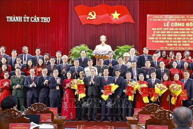 Chủ tịch Quốc hội Trần Thanh Mẫn dự Lễ công bố Nghị quyết sáp nhập đơn vị hành chính cấp tỉnh tại thành phố Cần Thơ. Ảnh: Doãn Tấn/TTXVN
