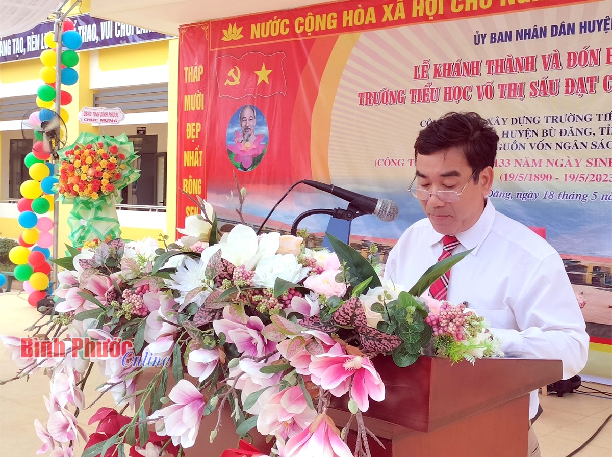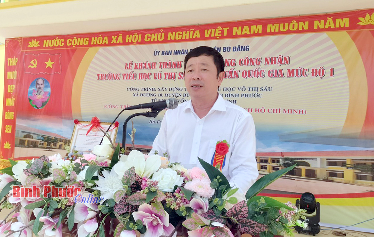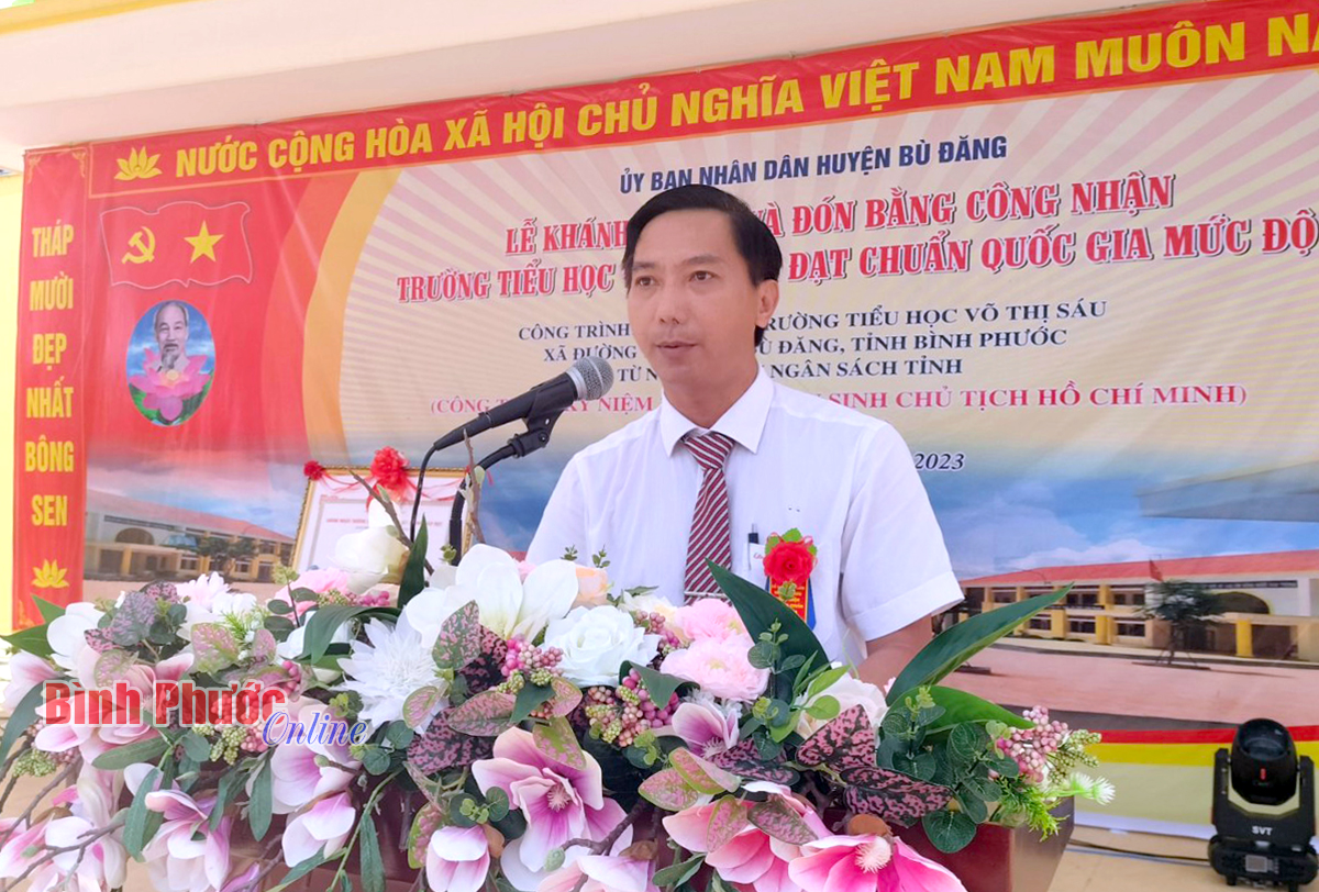 Chủ tịch UBND huyện Bù Đăng Trần Thanh Hòa phát biểu tại lễ khánh thành và đón bằng công nhận Trường tiểu học Võ Thị Sáu đạt chuẩn quốc gia mức độ 1