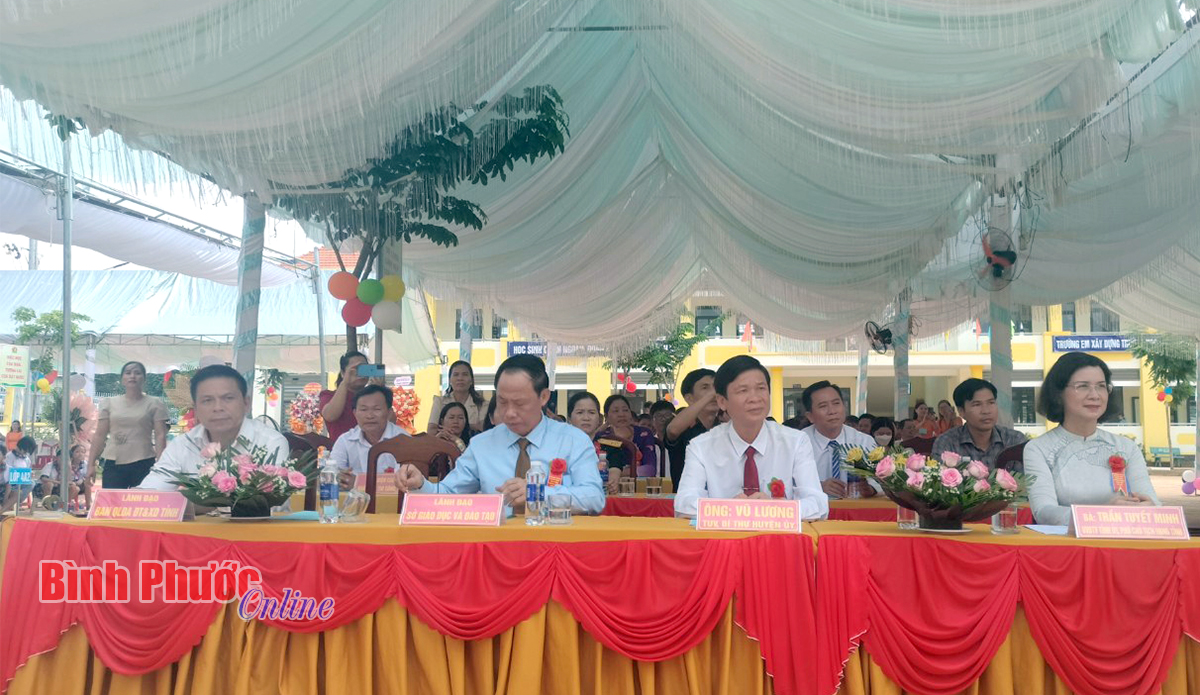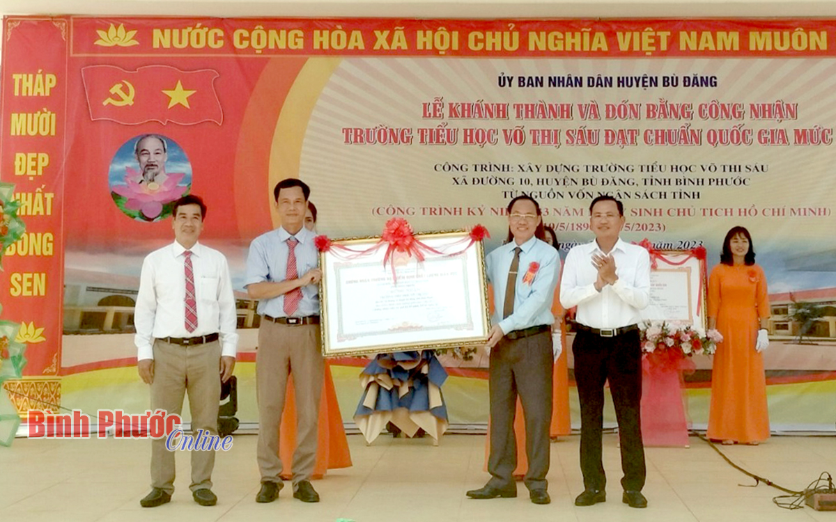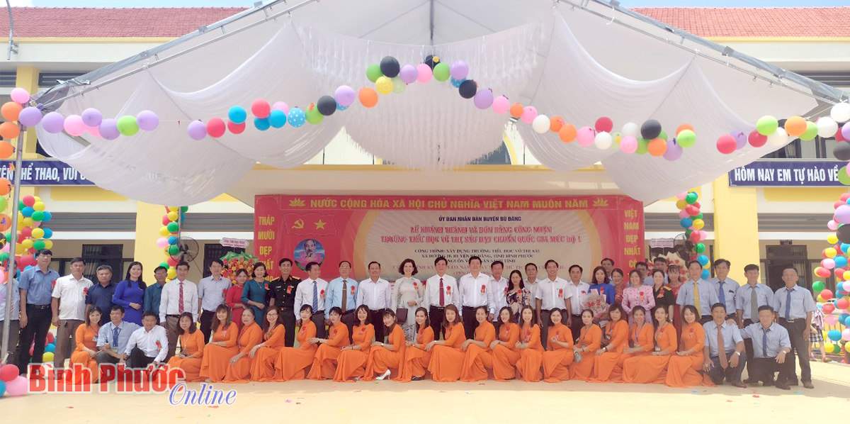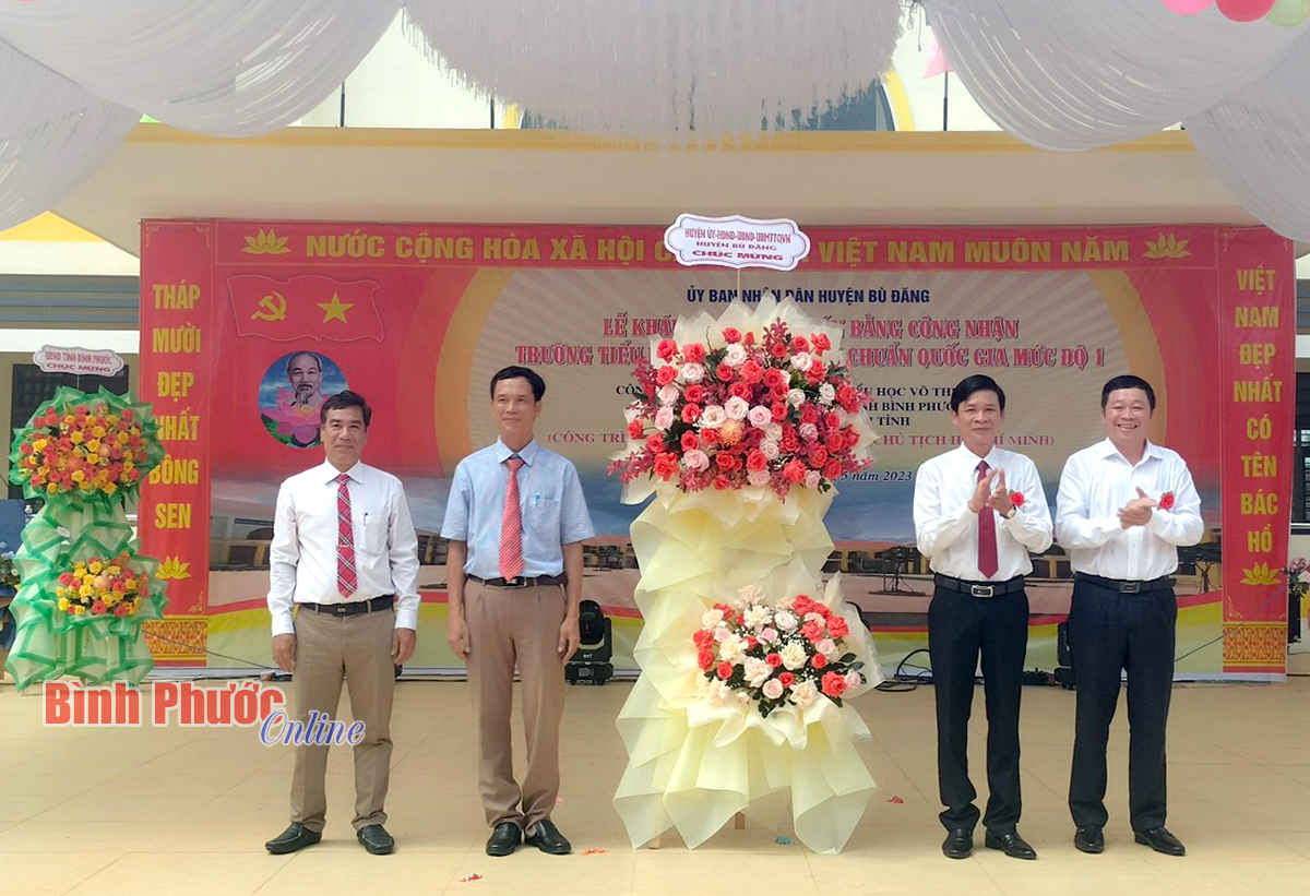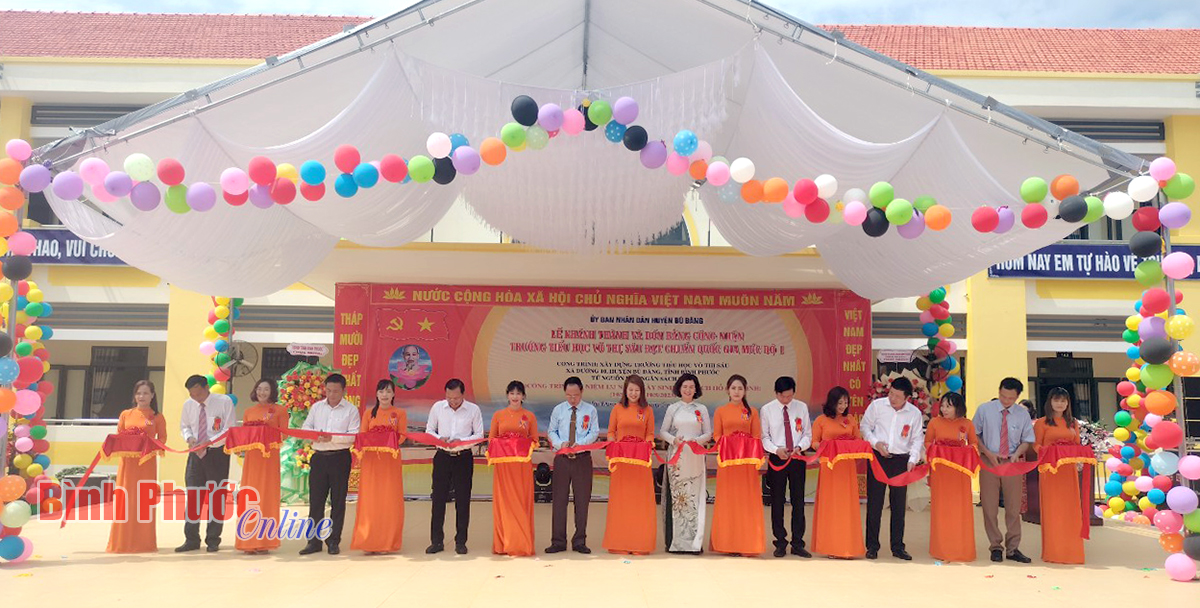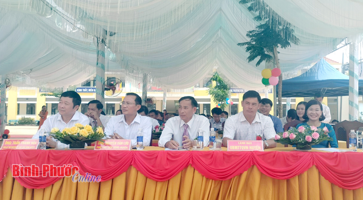 Ủy viên Ban Thường vụ Tỉnh ủy, Phó Chủ tịch UBND tỉnh Trần Tuyết Minh; Chủ tịch UBND huyện Bù Đăng Trần Thanh Hòa trao bằng công nhận trường đạt chuẩn quốc gia mức độ 1 cho thầy và trò nhà trường