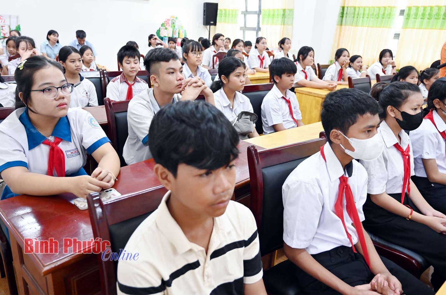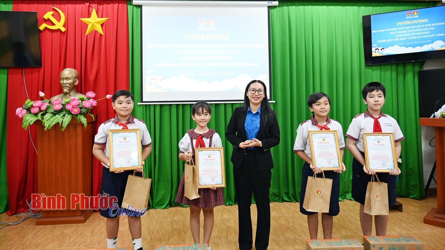 Nhân dịp này, Tỉnh đoàn, Hội đồng Đội tỉnh đã trao thư khen cho các em học sinh Trường Tiểu học An Lộc B (thị xã Bình Long) đạt thành tích xuất sắc tại vòng bán kết sân chơi “Thiếu nhi Việt Nam - Vươn ra thế giới” năm 2025. Cụ thể: Em Phạm Nhã My, lớp 5/3, đạt 93 điểm, xếp hạng Nhất toàn quốc; em Trần Phúc Thịnh, lớp 5/3, đạt 93 điểm, xếp hạng 5; em Lê Nguyễn Minh Sơn, lớp 5/5, đạt 92,25 điểm, xếp hạng 41; em Trần Lê Tuấn Minh, lớp 5/2, đạt 91,75 điểm, xếp hạng 82.
