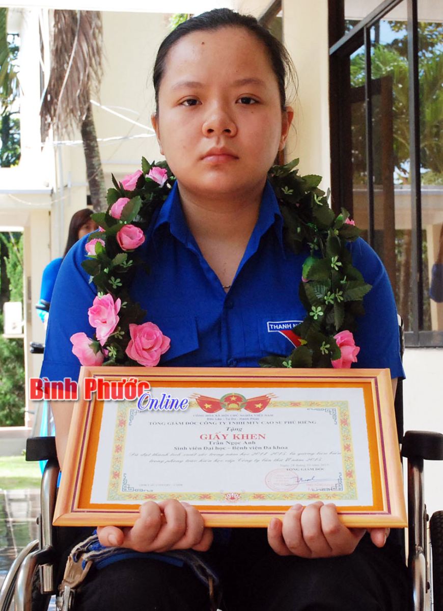 Nở nụ cười hiền, Ngọc Anh cho biết: “Năm lớp 10 Trường THPT Phú Riềng, em đang đi học bình thường thì tự nhiên bị té, sau đó đi lại khó khăn. Đôi chân cũng dần dần bị tê cứng và không đi lại được. Không lâu sau, em bị liệt luôn cả hai chân. Khi biết mình mắc bệnh dị dạng mạch máu, em đã khóc ròng nhiều ngày. Em chán nản, không muốn đến trường. Ba mẹ động viên, các bạn và thầy cô cũng đến tận nhà an ủi, chia sẻ. Nhưng sau khi được nghe về những tấm gương khuyết tật học giỏi, nhiều hoàn cảnh khó khăn vươn lên trong cuộc sống... em đã cố gắng đi học trở lại. Với sự giúp đỡ của ba mẹ, thầy cô, bạn bè, em đã lấy lại phong độ học tập. Em đã cố gắng học và nắm vững kiến thức trên lớp. Về nhà dành 1-2 tiếng đồng hồ tìm hiểu thêm tài liệu tham khảo. Thời gian còn lại em phải tập vật lý trị liệu cho đôi chân”.