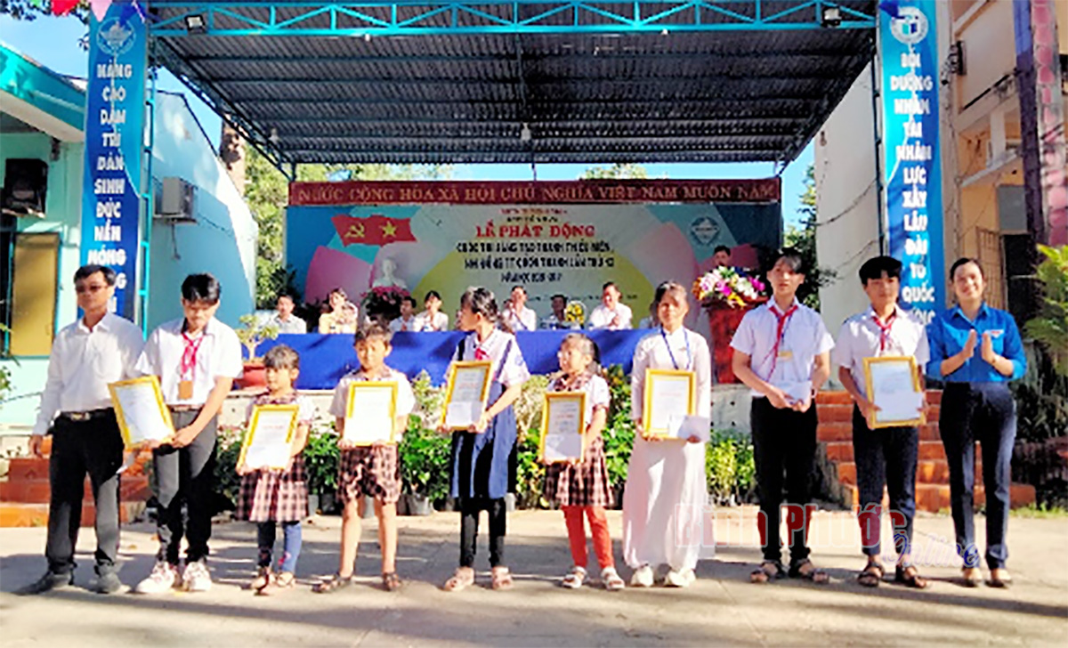 Phó bí thư Huyện đoàn Trịnh Thị Bình, Phó Ban tổ chức cuộc thi sáng tạo thanh thiếu niên, nhi đồng huyện Chơn Thành trao tặng giấy khen cho các em có sản phẩm sáng tạo xuất sắc