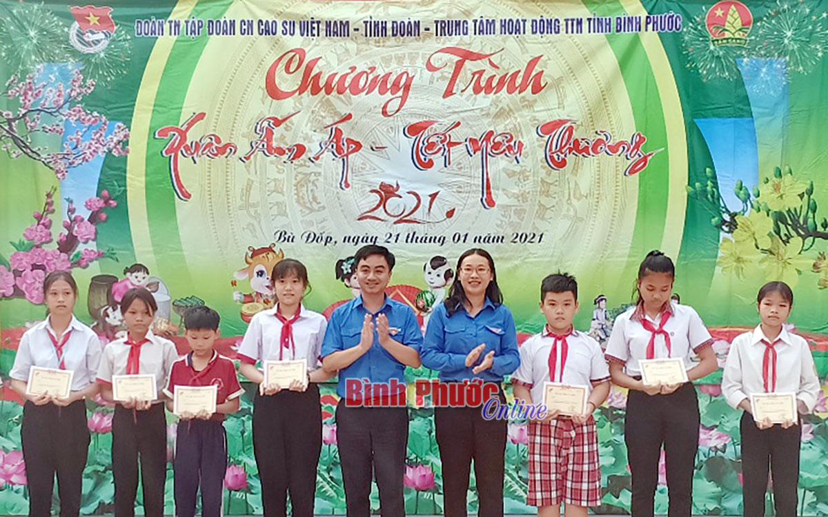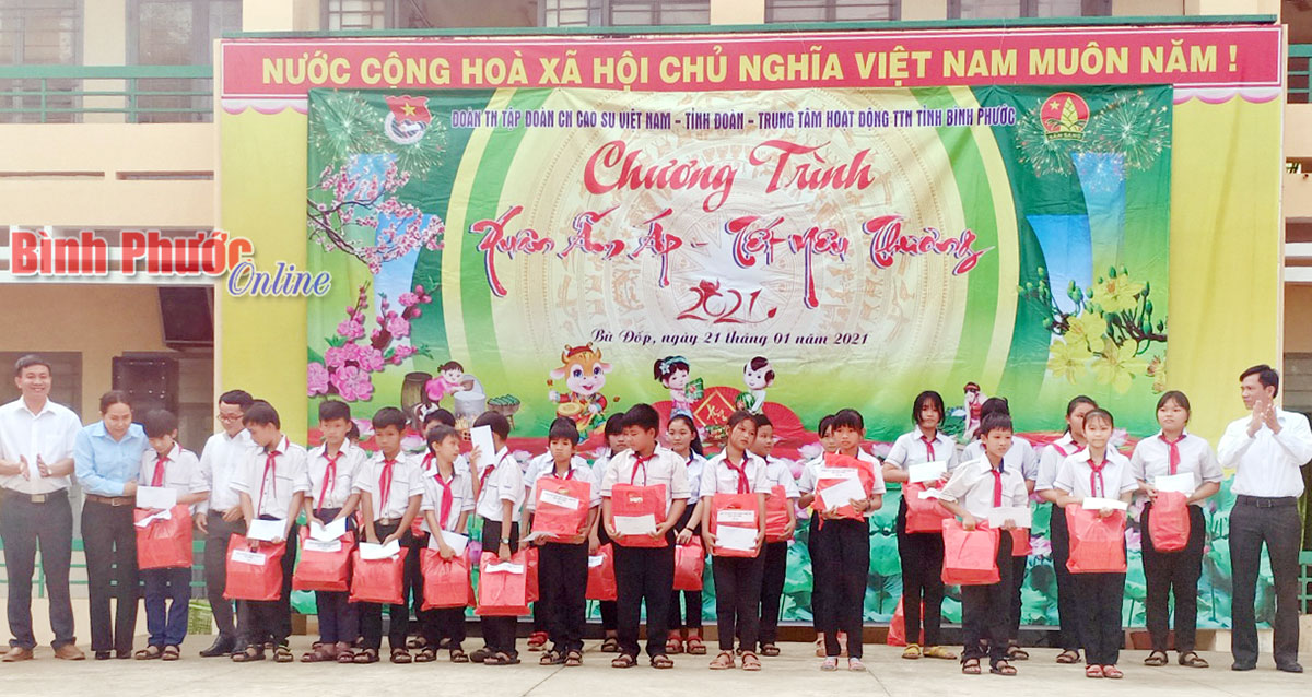 Dịp này, Ban tổ chức chiến dịch đã trao tặng 50 phần quà tết và tiền mặt trị giá 400 ngàn đồng/phần cho học sinh hoàn cảnh khó khăn thuộc trường THCS Tân Thành. Tặng 20 suất học bổng, trị giá 500 ngàn đồng/suất của Tập đoàn Công nghiệp cao su Việt Nam và 10 suất học bổng Vừ A Dính, trị giá 1 triệu đồng/suất cho học sinh vượt khó học tốt huyện Bù Đốp.