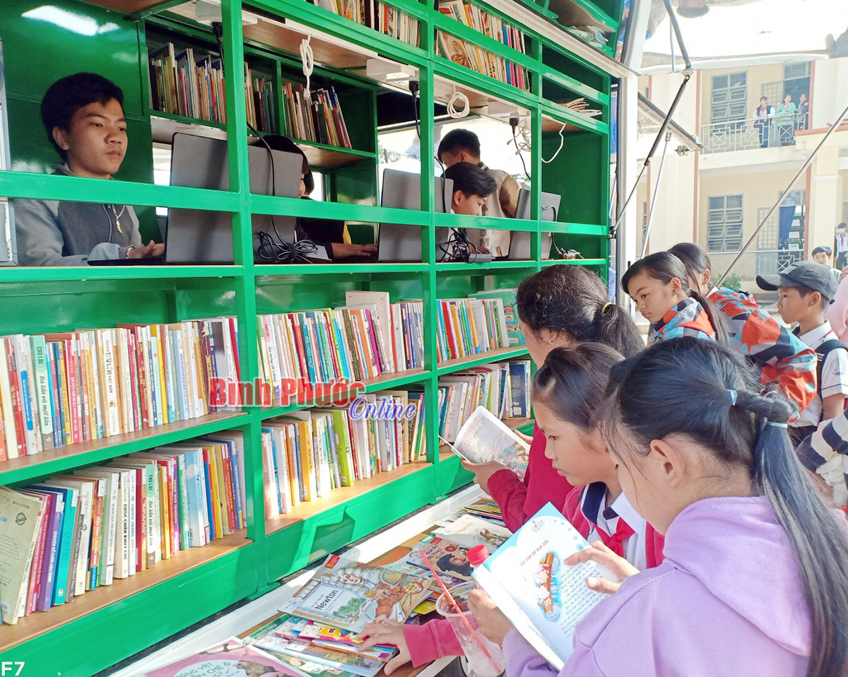 Học sinh trường THCS Tân Thành (Bù Đốp) tham gia đọc sách, truy cập internet tại thư viện lưu động