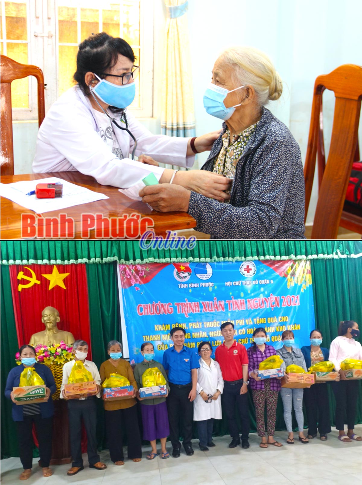 Trước đó, ngày 24-1, Tỉnh đoàn - Hội LHTN Việt Nam tỉnh đã cùng Hội Chữ thập đỏ Quận 9, TP. Hồ Chí Minh tổ chức chương trình tư vấn sức khỏe, khám bệnh, tặng quà có tổng giá trị gần 120 triệu đồng cho 300 người cao tuổi ở xã Đức Hạnh (huyện Bù Gia Mập); cùng Cục Thuế TP. Hồ Chí Minh, Phòng An ninh chính trị nội bộ - Công an tỉnh Bình Phước trao 150 phần quà (1 triệu đồng/ phần) cho người dân khó khăn tại Chương trình “Xuân yêu thương” ở xã Phú Trung, huyện Phú Riềng vào sáng 22-1.